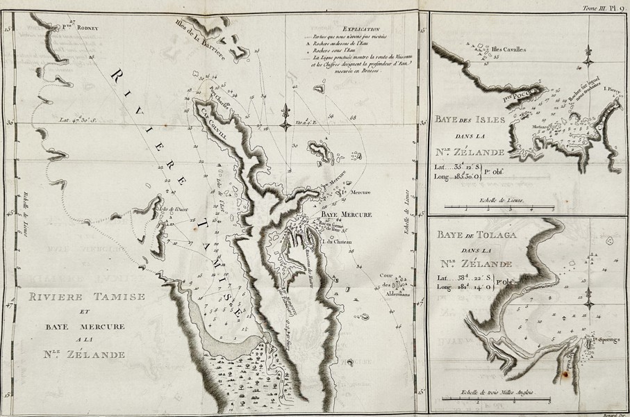 This engraving contains three distinct nautical charts printed on a single sheet, documenting key coastal discoveries in New Zealand. The largest map on the left depicts the Thames River and Mercury Bay, while the two smaller charts on the right provide detailed views of the Bay of Islands and Tolaga Bay, with all maps featuring precise depth soundings in fathoms and anchoring points for the HMS Endeavour. This work was published as part of the official account of Cook’s first voyage, serving as a landmark navigational record that provided the first accurate outlines of these regions for a global audience. The charts include detailed geographical notes and "Explications" in French, identifying submerged rocks and specific coastal features, reflecting the rigorous scientific and surveying standards of the Enlightenment era.
