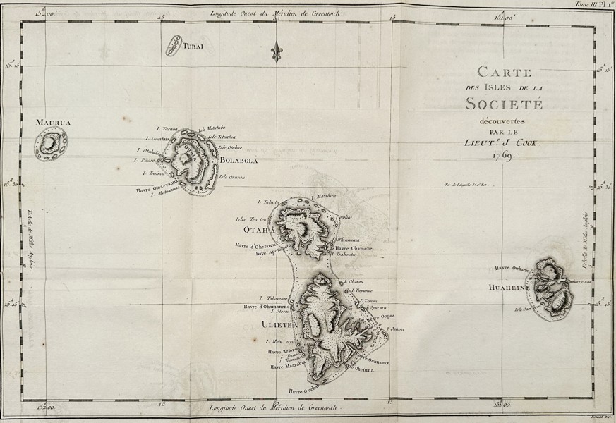 Bilder Captain James Cook (1728–1779) – Map of the Society Islands discovered by Lieut. J. Cook – engraving (1774)