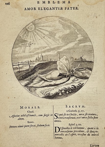 This engraving features a circular emblem depicting a silkworm emerging from its cocoon and transforming into a moth, set against a landscape illuminated by a radiant sun. The scene is an allegorical representation of the soul's transformation and the refining power of love, as suggested by the Latin title Amor Elegantiae Pater, meaning Love is the Father of Elegance. The work was published as part of Proteus ofte Minne-beelden verandert in Sinne-beelden, a highly popular emblem book that combined moralistic, religious, and romantic themes through symbolic imagery and multilingual commentary. These emblems were designed to provide both aesthetic pleasure and ethical instruction, reflecting the deep cultural integration of visual symbolism in seventeenth-century Dutch society.