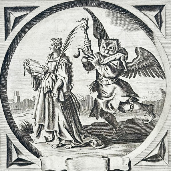 This engraving features a circular emblem titled Staten en Ampten, depicting a winged figure representing Wisdom leading a blindfolded, stumbling figure representing Ignorance through a rocky landscape. The allegory illustrates the guidance required for those in positions of authority and the dangers of proceeding without foresight, as emphasized by the motto L'Ignoranza corre, la Prudenza lentamente segue il passo. The work was published as part of Proteus ofte Minne-beelden verandert in Sinne-beelden, a highly popular emblem book that combined moralistic, religious, and romantic themes through symbolic imagery and multilingual commentary. These emblems were designed to provide both aesthetic pleasure and ethical instruction, reflecting the deep cultural integration of visual symbolism in seventeenth-century Dutch society.