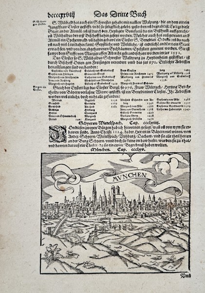 This print presents a detailed topographical view of the city of Munich, depicted within its historical fortifications and surrounded by rolling hills. The cityscape highlights prominent Gothic spires, civic buildings, and a bridge crossing the Isar River, all framed by a decorative banner bearing the city name. The illustration is set within a page of German fraktur text and was published as part of the Cosmographia, the earliest German-language description of the world. This influential work combined geographical maps with historical accounts and city views, serving as a primary source for sixteenth-century scholars to understand the urban development and geography of central Europe.