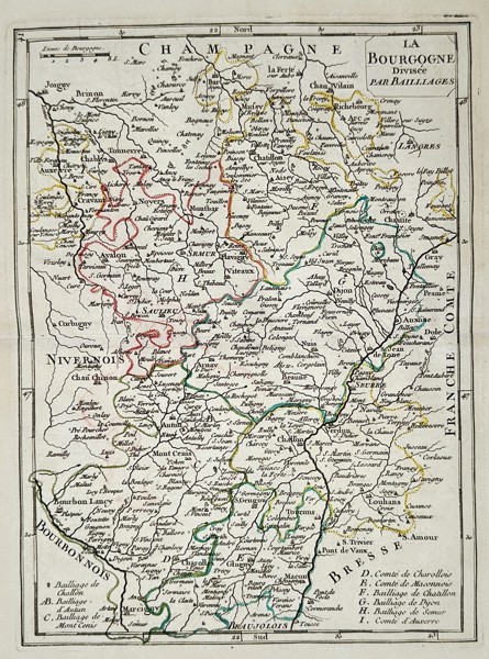 This print presents a detailed geographical map of the province of Burgundy, divided into its various judicial and administrative districts known as bailliages. The map identifies major urban centers such as Dijon, Autun, and Chalon, alongside topographical features including the course of the Saone river and the rugged terrain of the Morvan massif. The territorial boundaries of each district are delineated with hand-applied outlines in green, yellow, and red, providing a clear visual representation of the region's complex political organization during the Ancien Regime. A comprehensive legend in the lower left corner provides an alphabetical key to the numbered bailliages, reflecting the practical cartographic style used for administrative purposes in mid-eighteenth-century France.