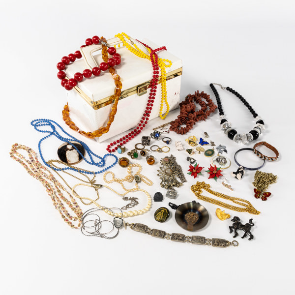 Bijouterier, ett parti, halsband, broscher, ringar, m.m., kommer i smyckesskrin