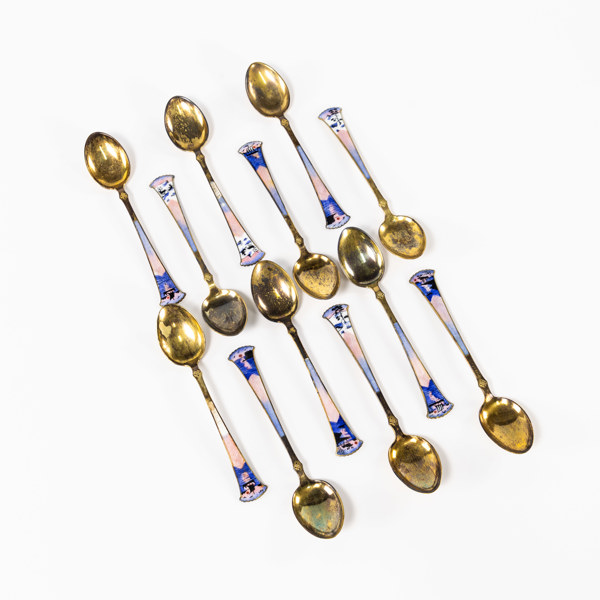 Kaffeskedar, 12 st, silver med emalj, Norge