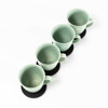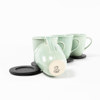 Kaffekoppar med fat i svartlackerat trä, 4+4 delar, stengods med mintgrön glasyr, Höganäs, kopparnas höjd 9,5 cm