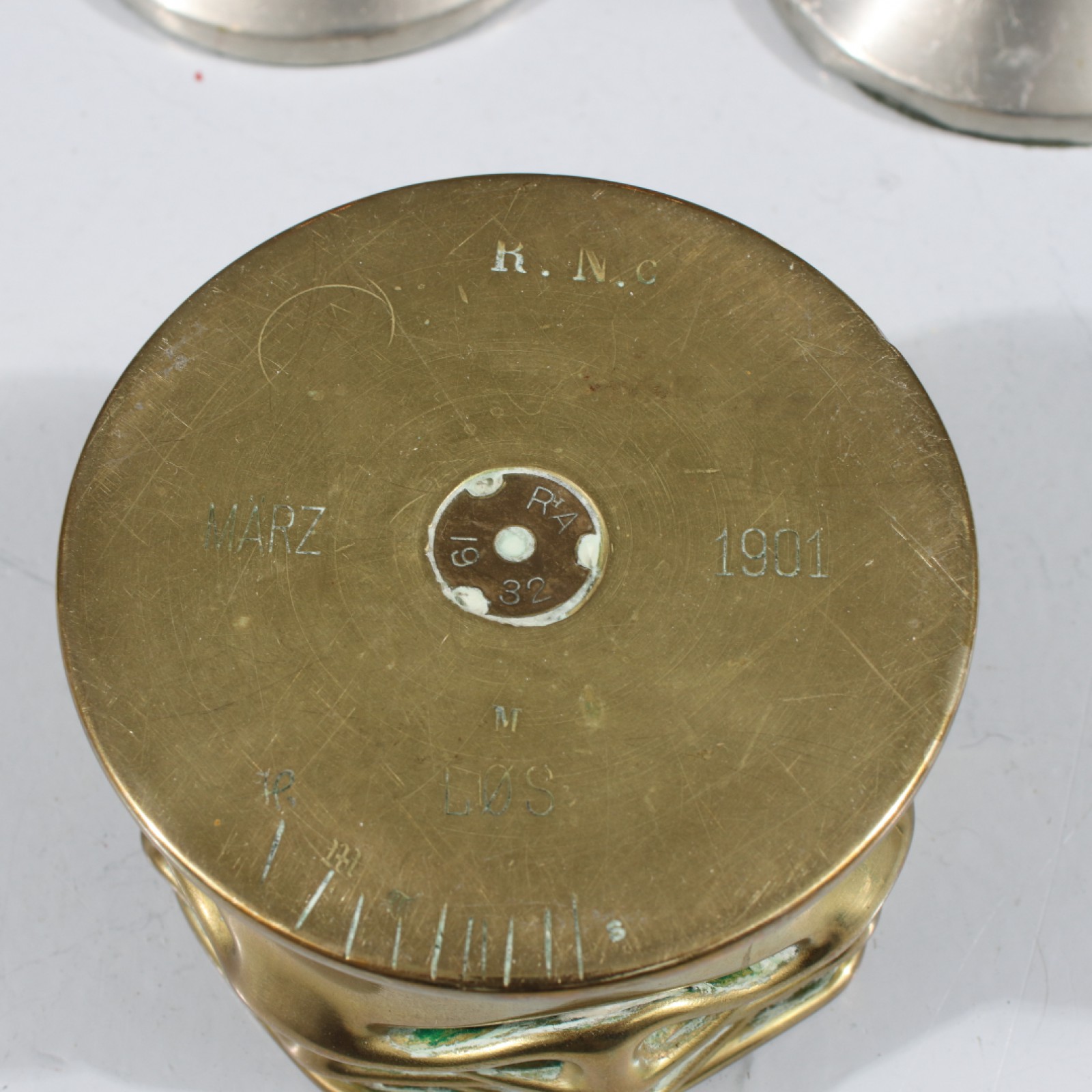 5 delar, 1 par ljusstakar W.M.F (Westerås Metallfabrik) 18,1900-tal i mässing, 1st ljuslykta "Skyttegravskonst" märkt März 1901 av granat i mässing samt 1 par ljusstakar i tenn, höjd 6-21,5 cm. (vån3)