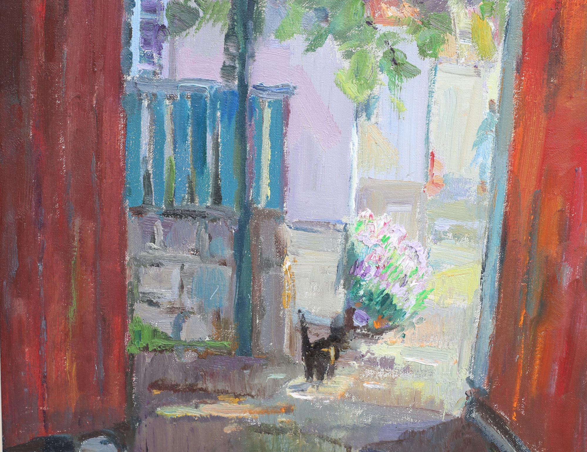 oljemålning på duk, innergård med blommor och katt, signerad, 51x36