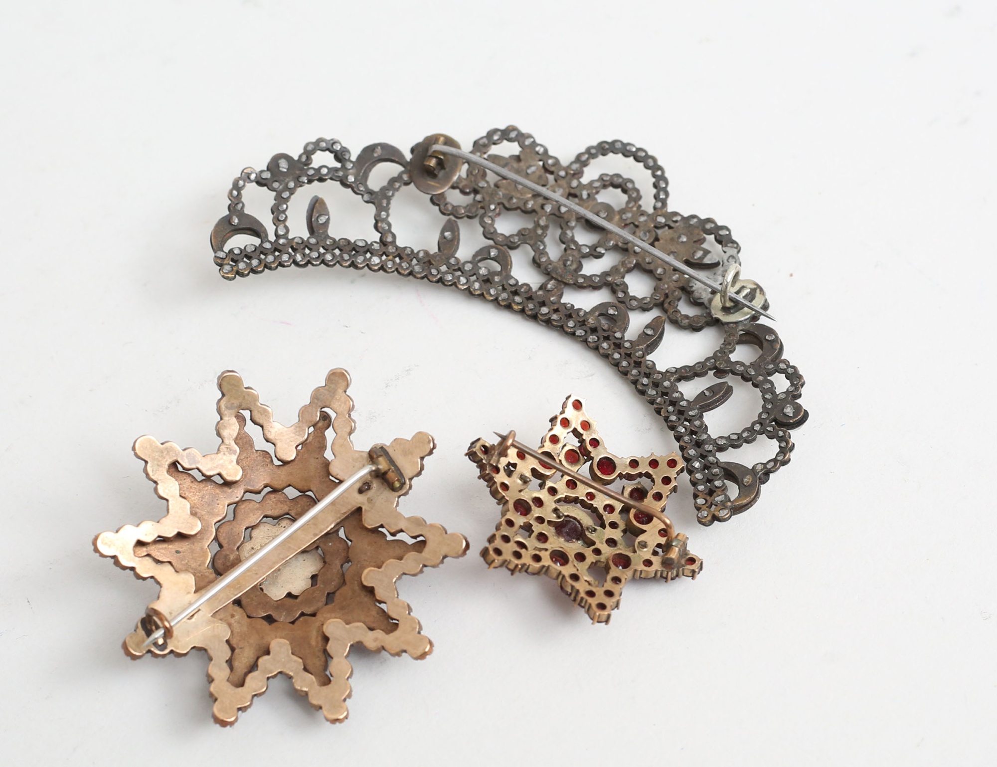 diameter 48 respektive 35 mm., del av tiara c.1800, slipat stål, monterad som brosch (3)