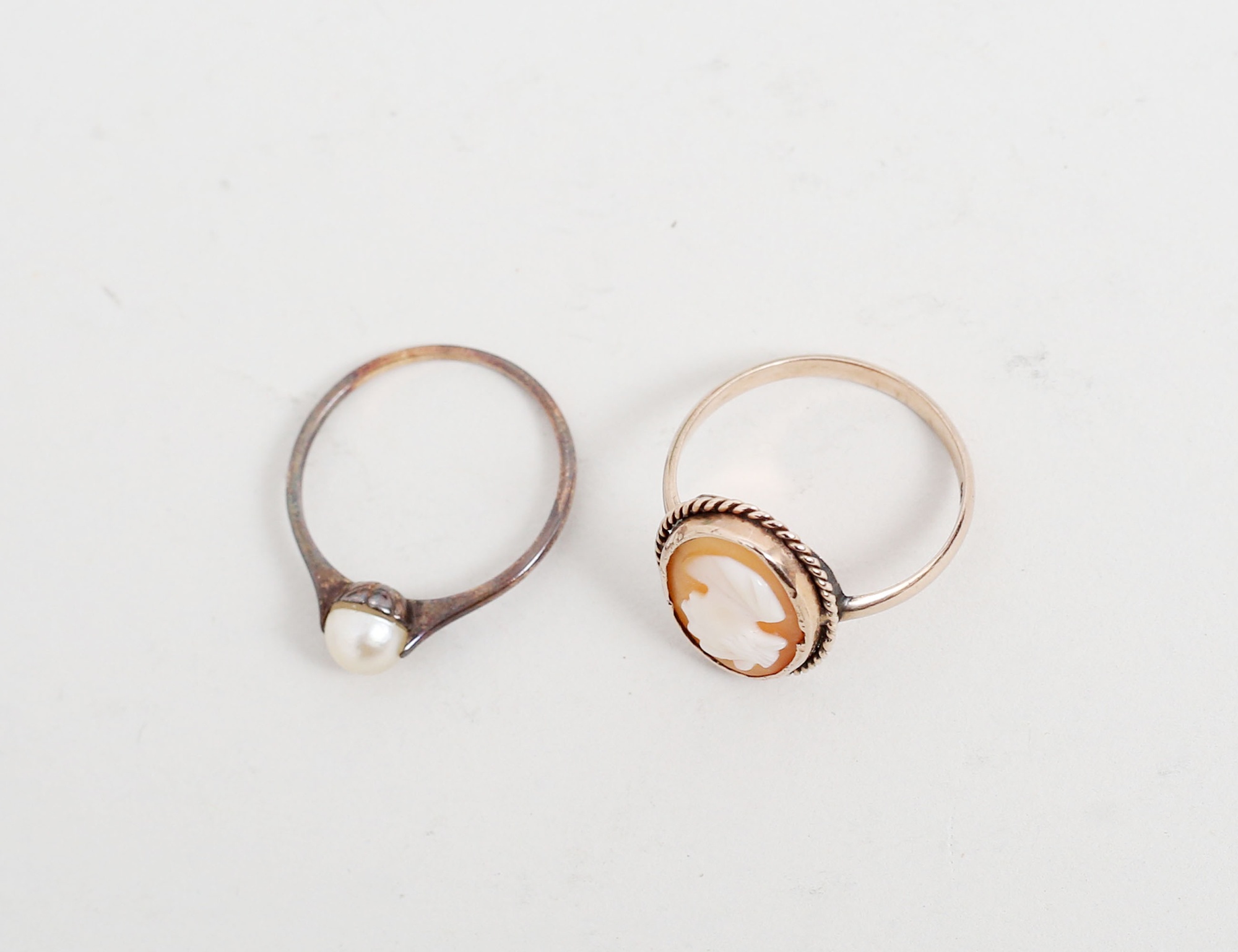 14k med odlad pärla, vikt 1,27 gram, storlek 17,5/54-55, 9k med snäckcamé, vikt 2,29 gram, storlek 18/56-57
