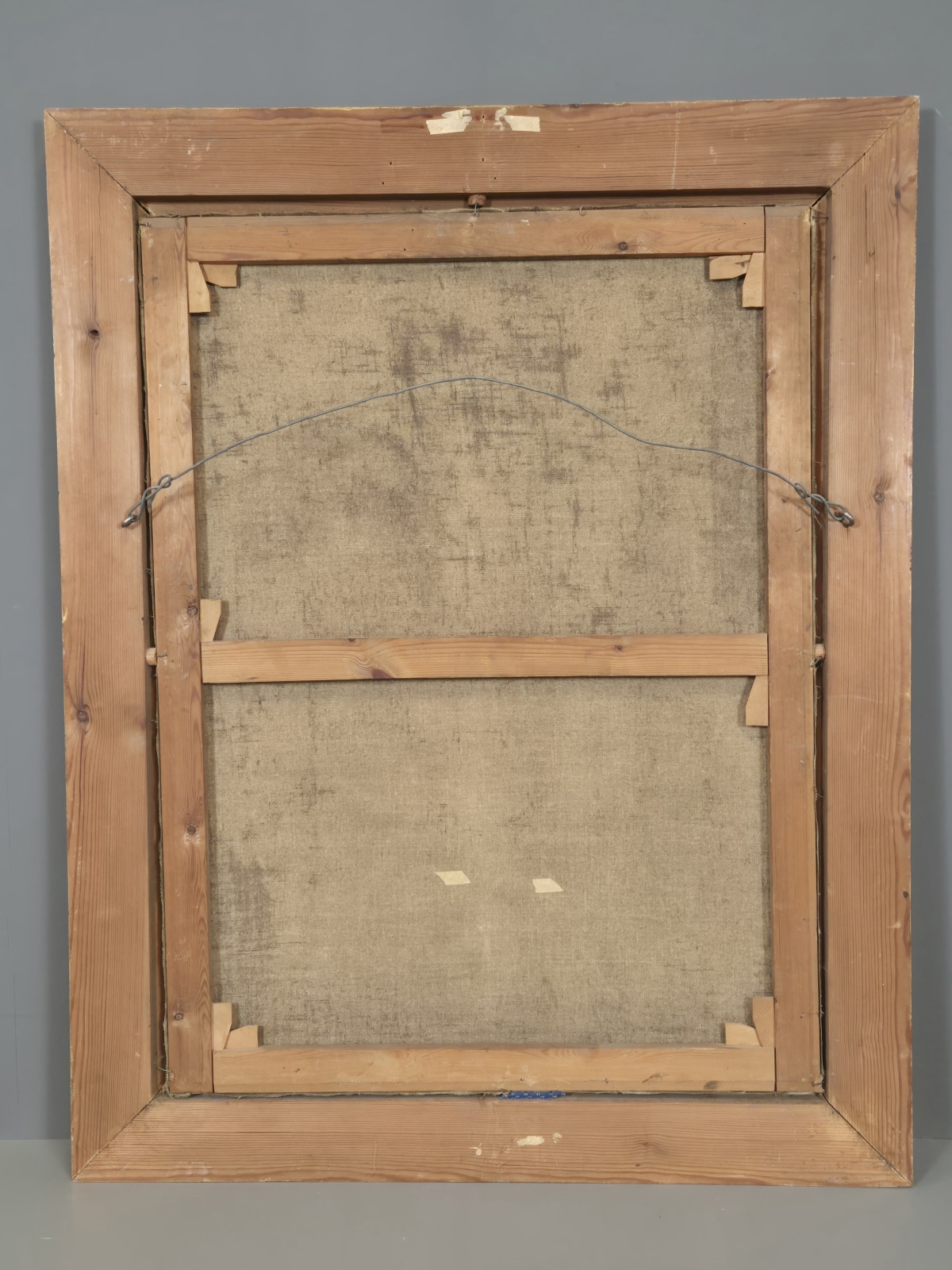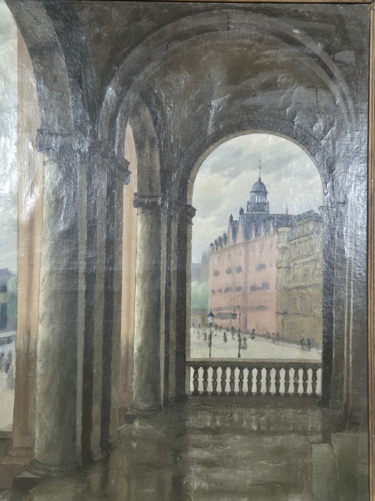 Målning med oidentifierat stadsmotiv. Åldersslitage och lagningar. 97cm x 123cm.