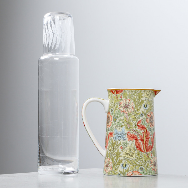 Vattenkaraff med glas, Orrefors, samt Kanna, William Morris
