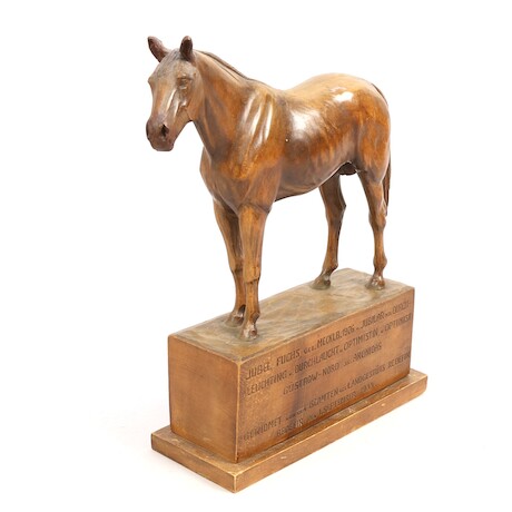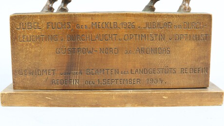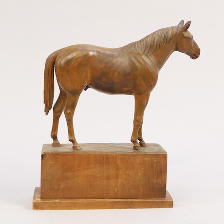 Auktioner Konst & Grafik Hästskulptur, skuret och betsat trä, oidentifierad konstnär, gåvogravyr daterad 1934, Landsgestuet Redefin Meklenburg Vorpommern / Tyskland. 30 X 33 X 9 cm