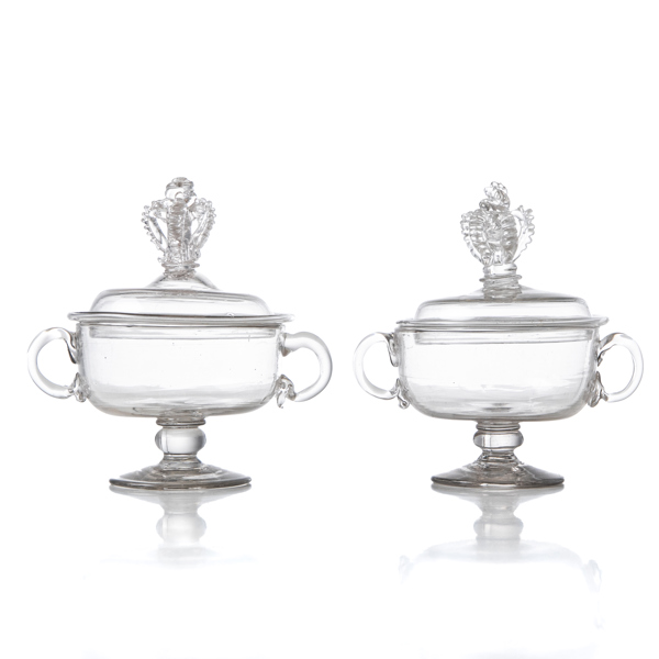 SMÖRASKAR MED LOCK, glas, ett par, 1700-talets andre hälft, sannolikt Kosta glasbruk, påklippta hänklar.
