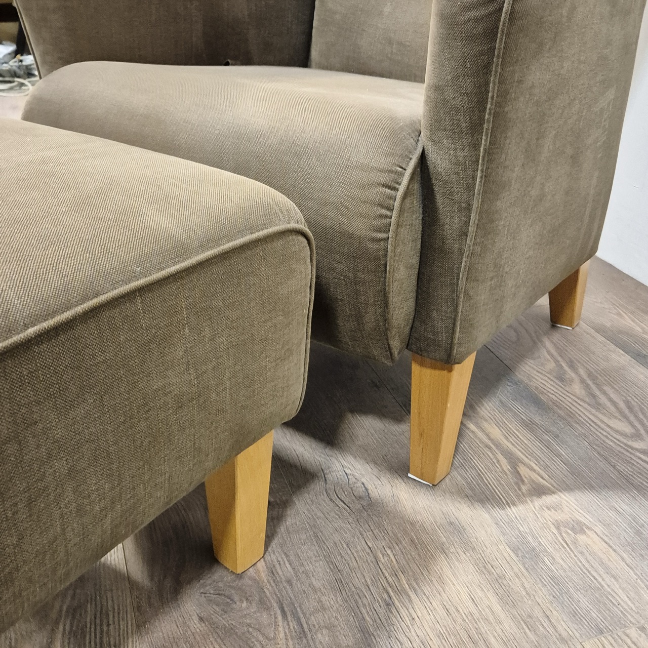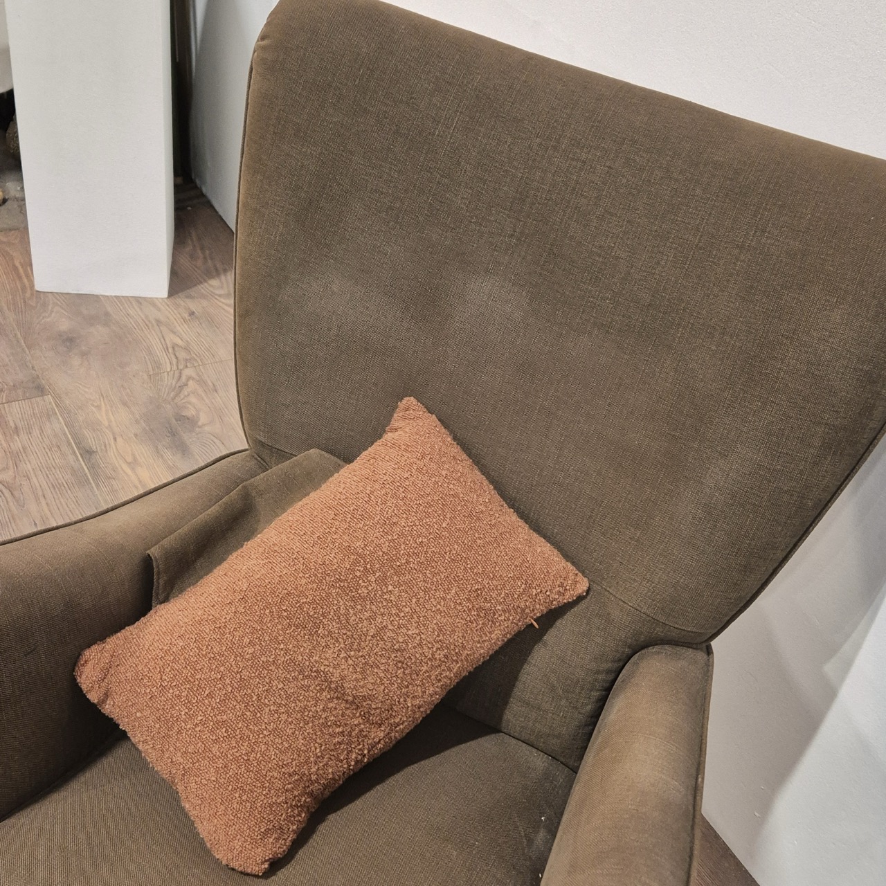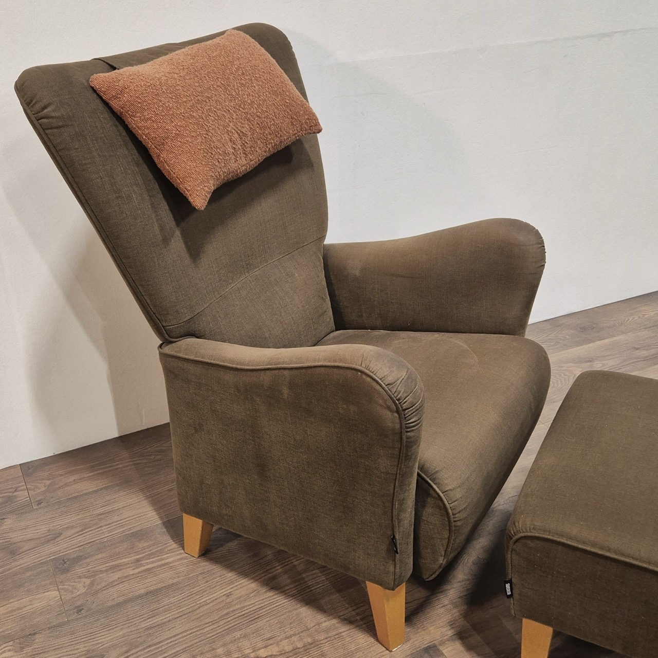Fåtölj med fotpall Swedese i brunt. Fläckar finns, slitage på armstöd