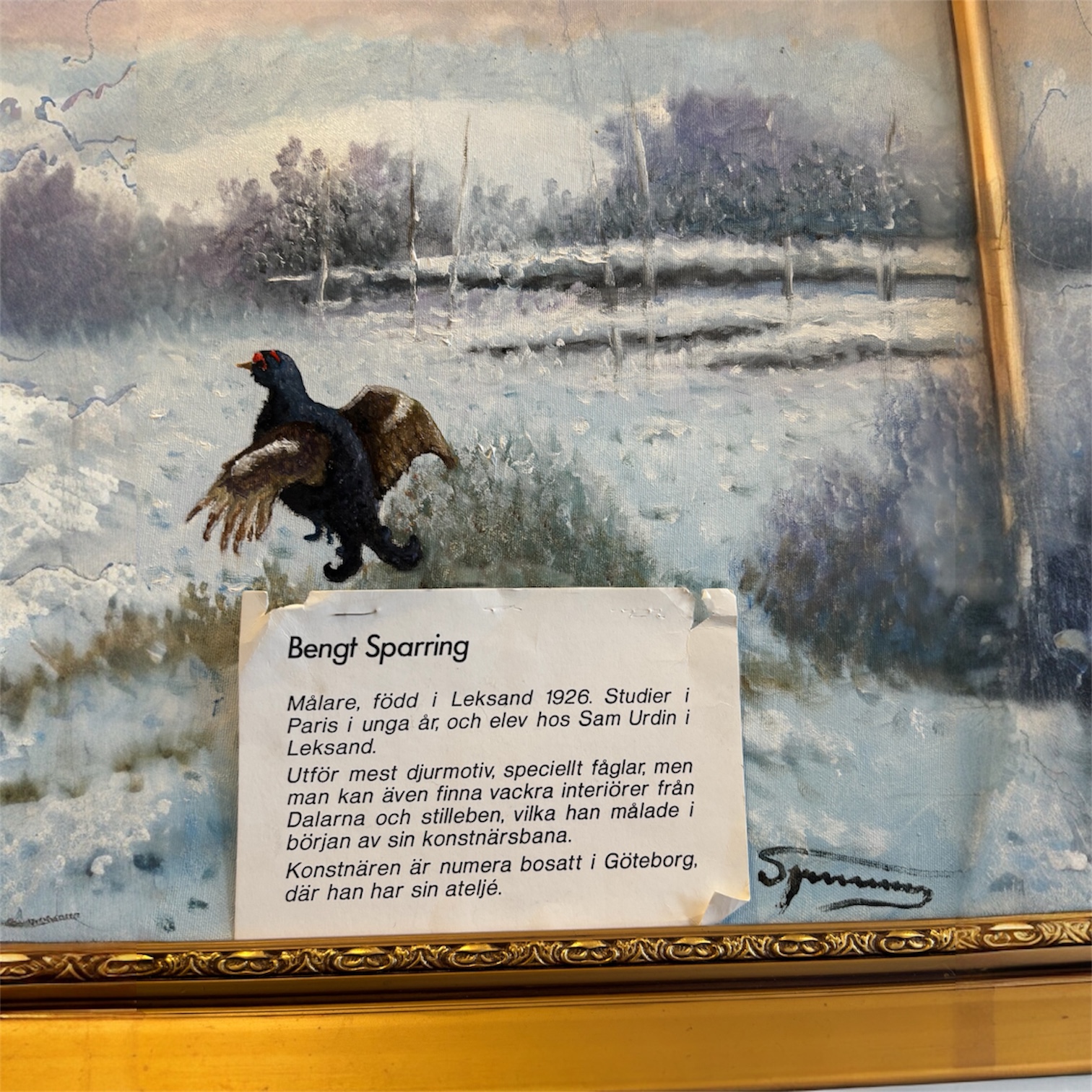 Bengt SparringMålare, född i Leksand 1926. Studier iParis i unga år, och elev hos Sam Urdin iLeksand.Utför mest djurmotiv, speciellt fåglar, menman kan även finna vackra interiörer frånDalarna och stilleben, vilka han målade ibörjan av sin konstnärsbana.Konstnären är numera bosatt i Göteborg,där han har sin ateljé.