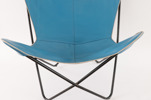 Så kallad "Fladdermusfåtölj". Galonklädsel. Svartmålad stålrör.