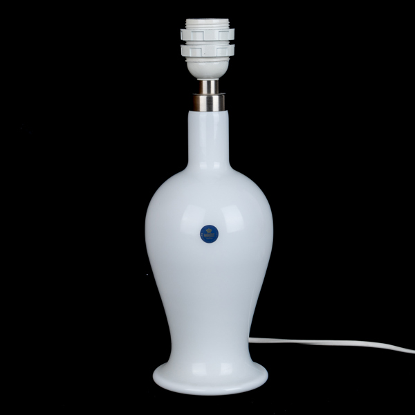 Vitt glas, etikettmärkt, fäste av vitmetall, höjd ca 33 cm