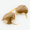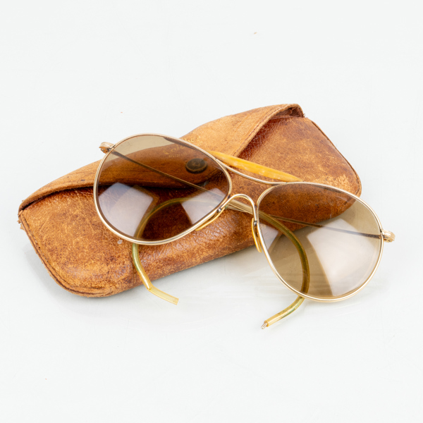 Mässingsfärgade skalmar med plastdetalj, tonade glas med styrka, tot bredd ca 14 cm, med originalfodral