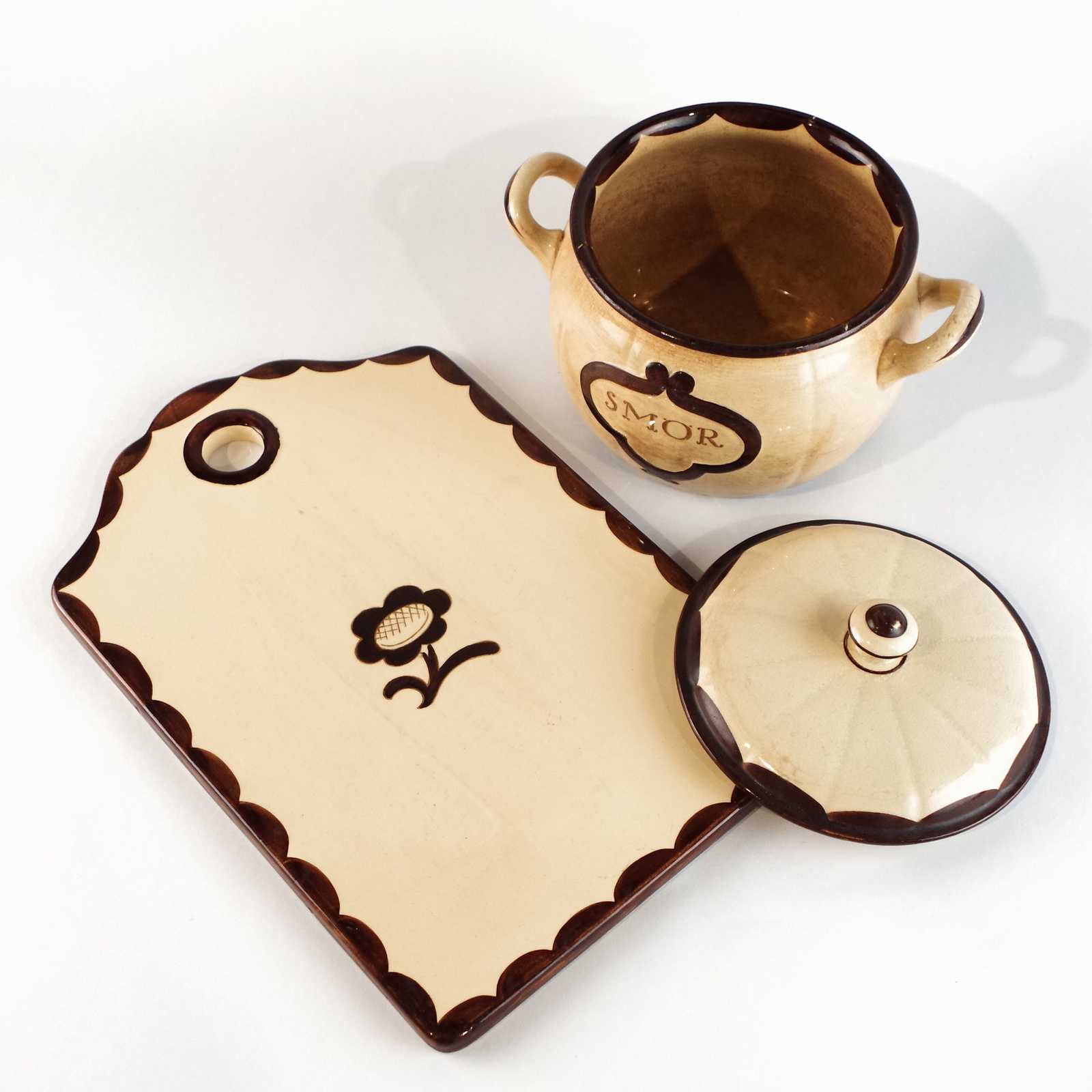 BURK & PLAKETT/SKÄRBRÄDA Gustavsberg, Pyro. 29x29cm största. (krackeleringar och missfärgningar på burk)