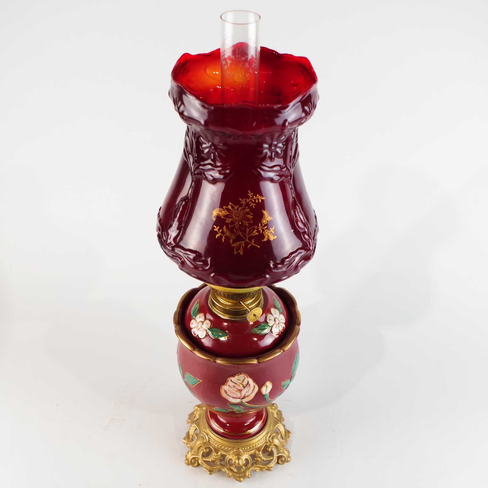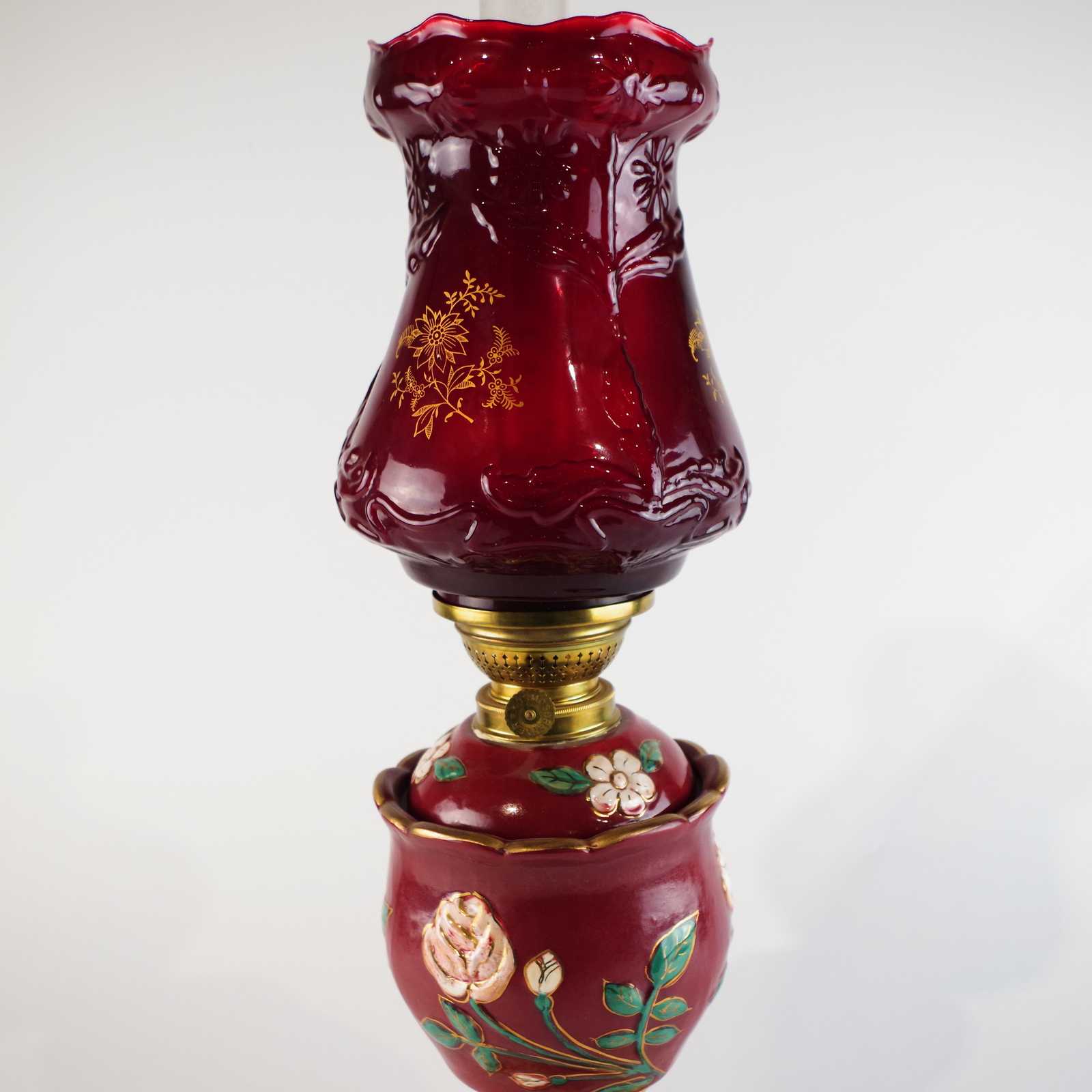 BORDSFOTOGENLAMPA tidigt 1900 tal, majolika. H:56cm totalt.