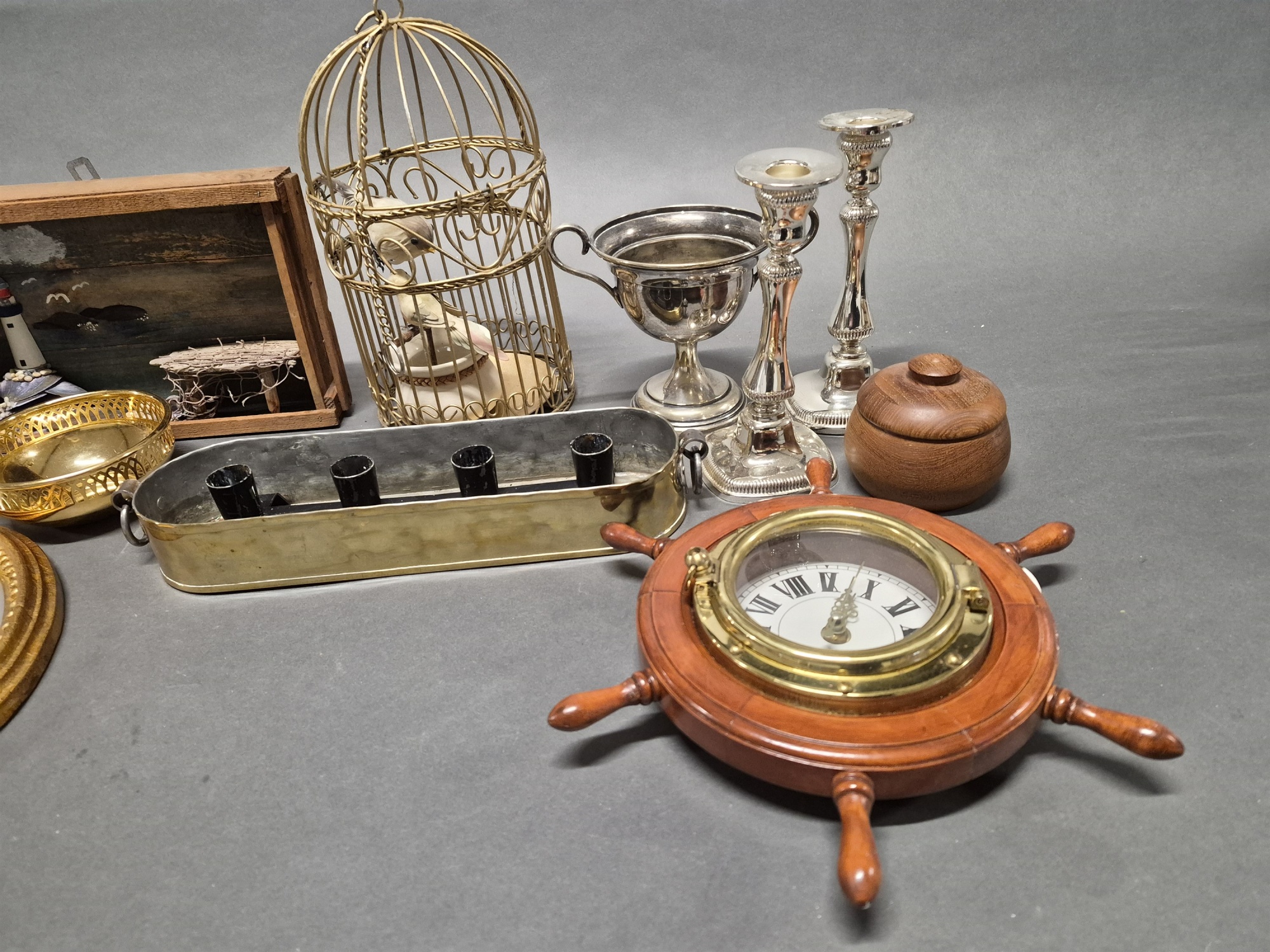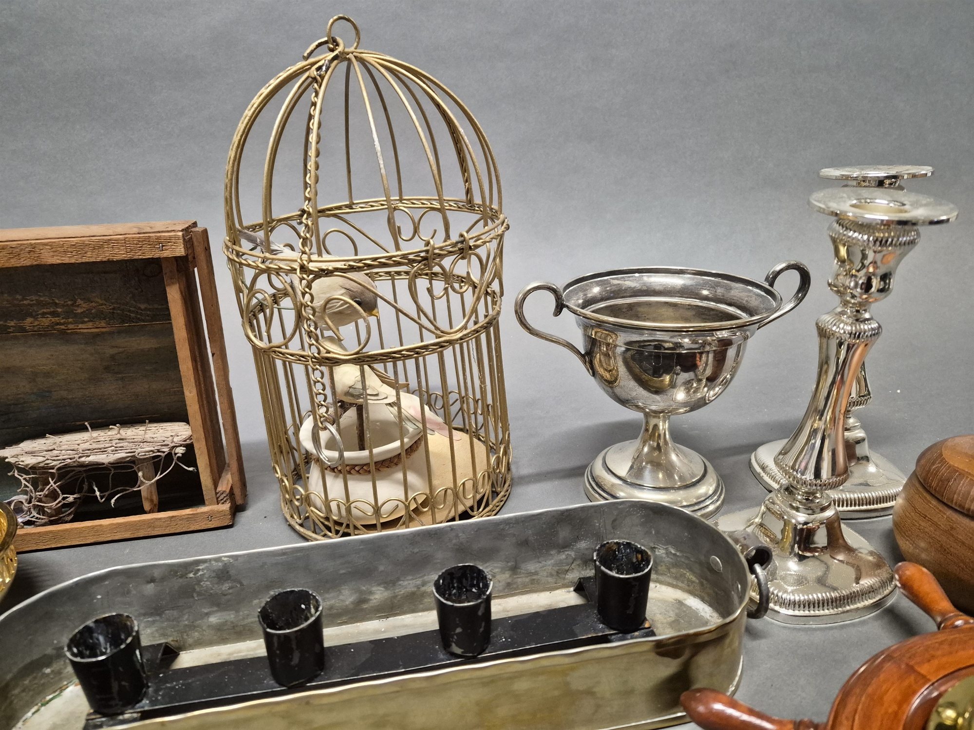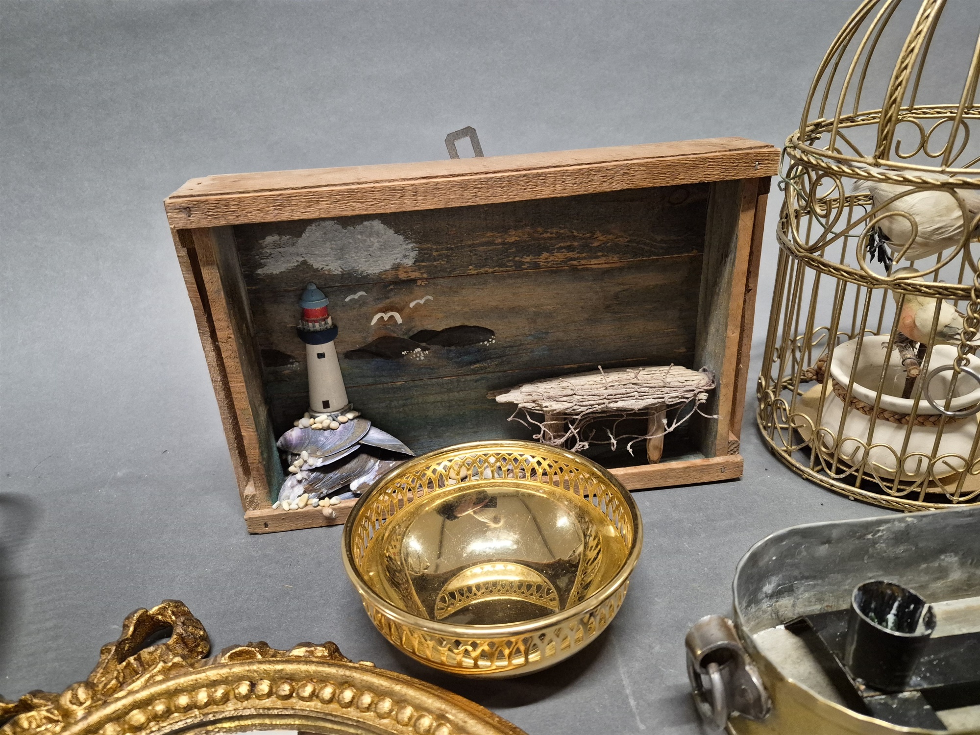 Parti metall, dekorationsföremål bla "fågelbur" och klocka roder, högsta höjd 30 cm