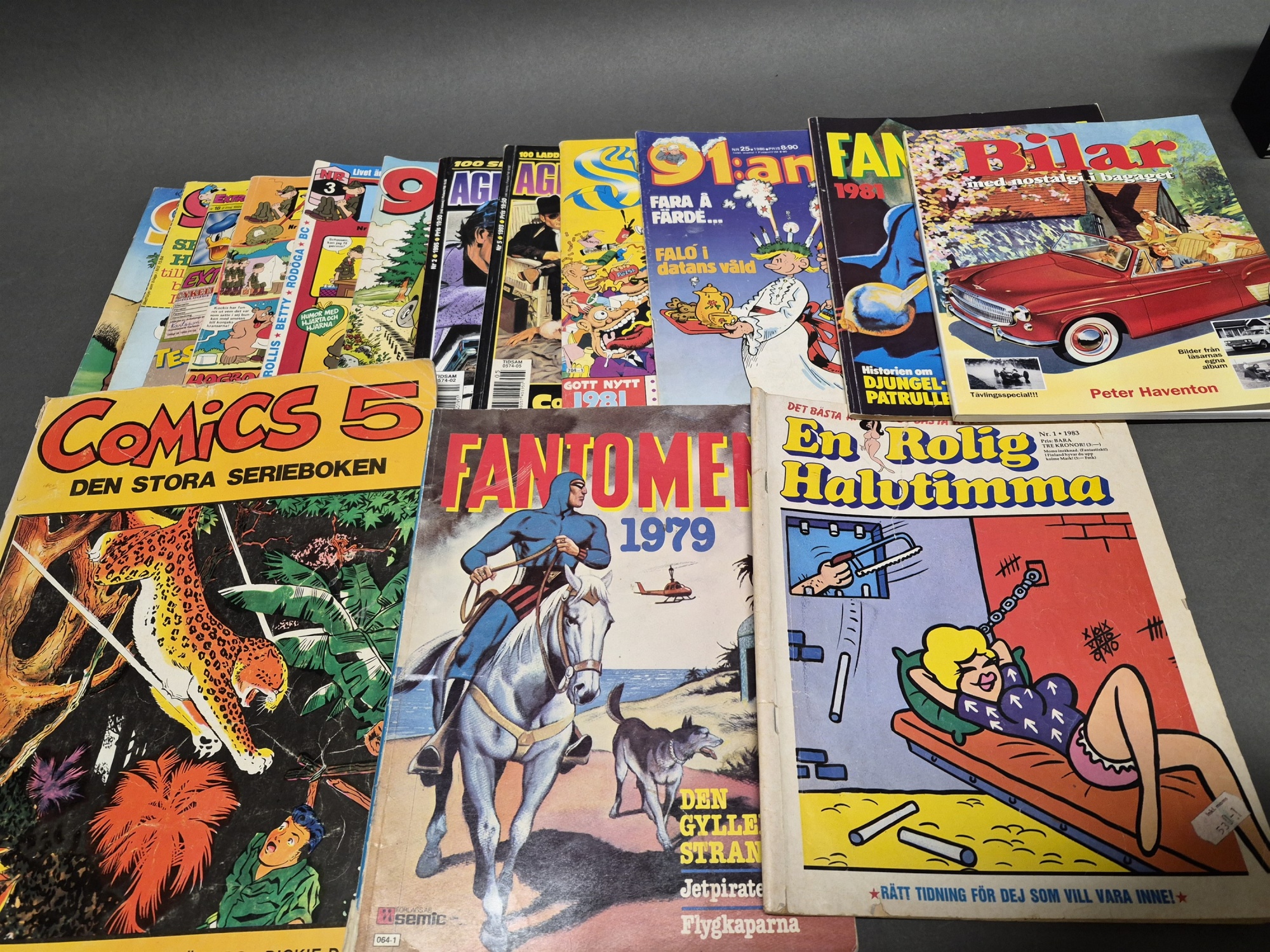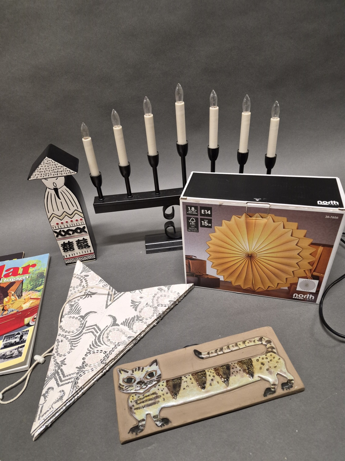 Bilder Parti bla serietidningar, elljusstake och keramiktavla Elbogen, högsta höjd 33 cm