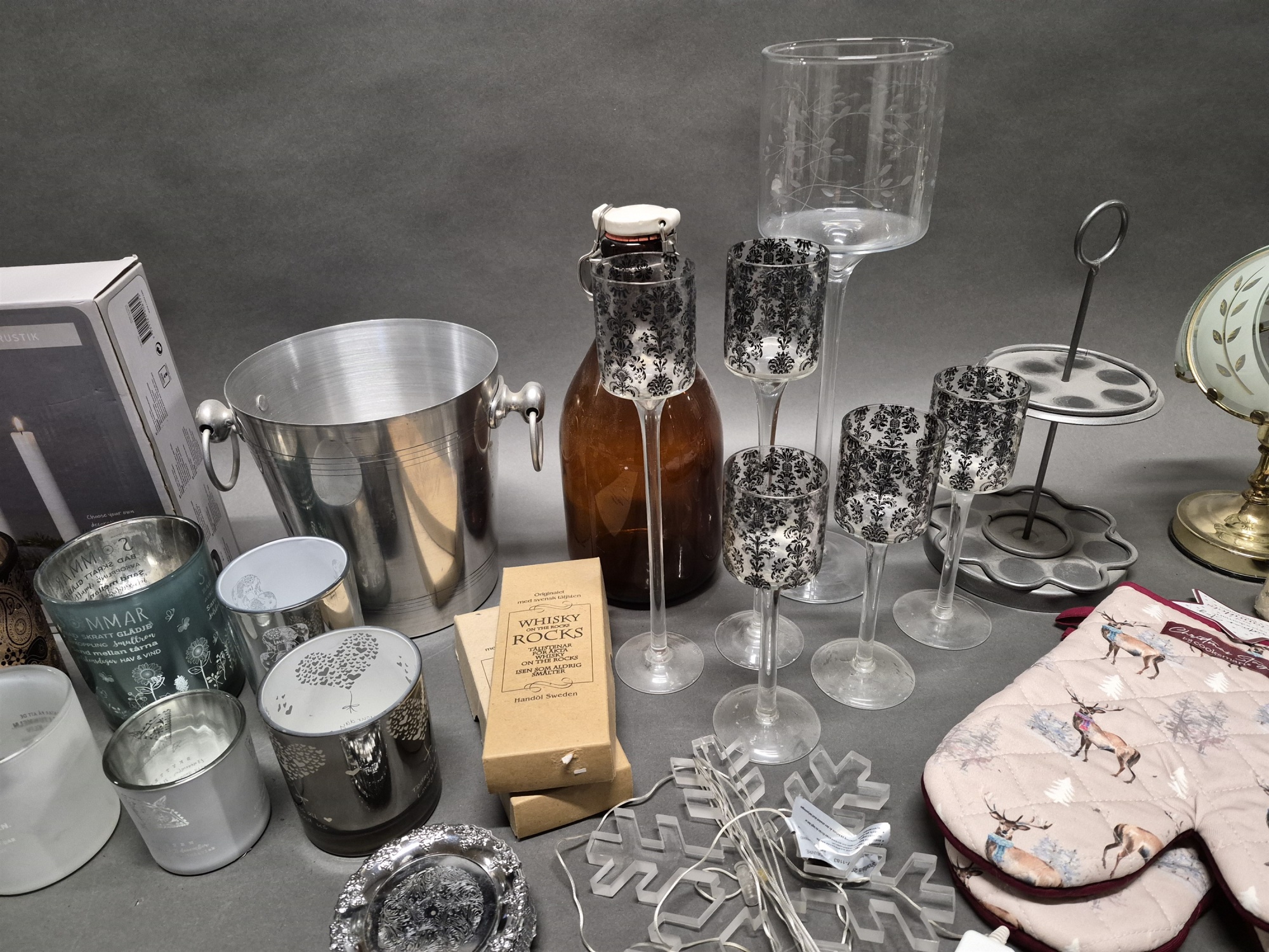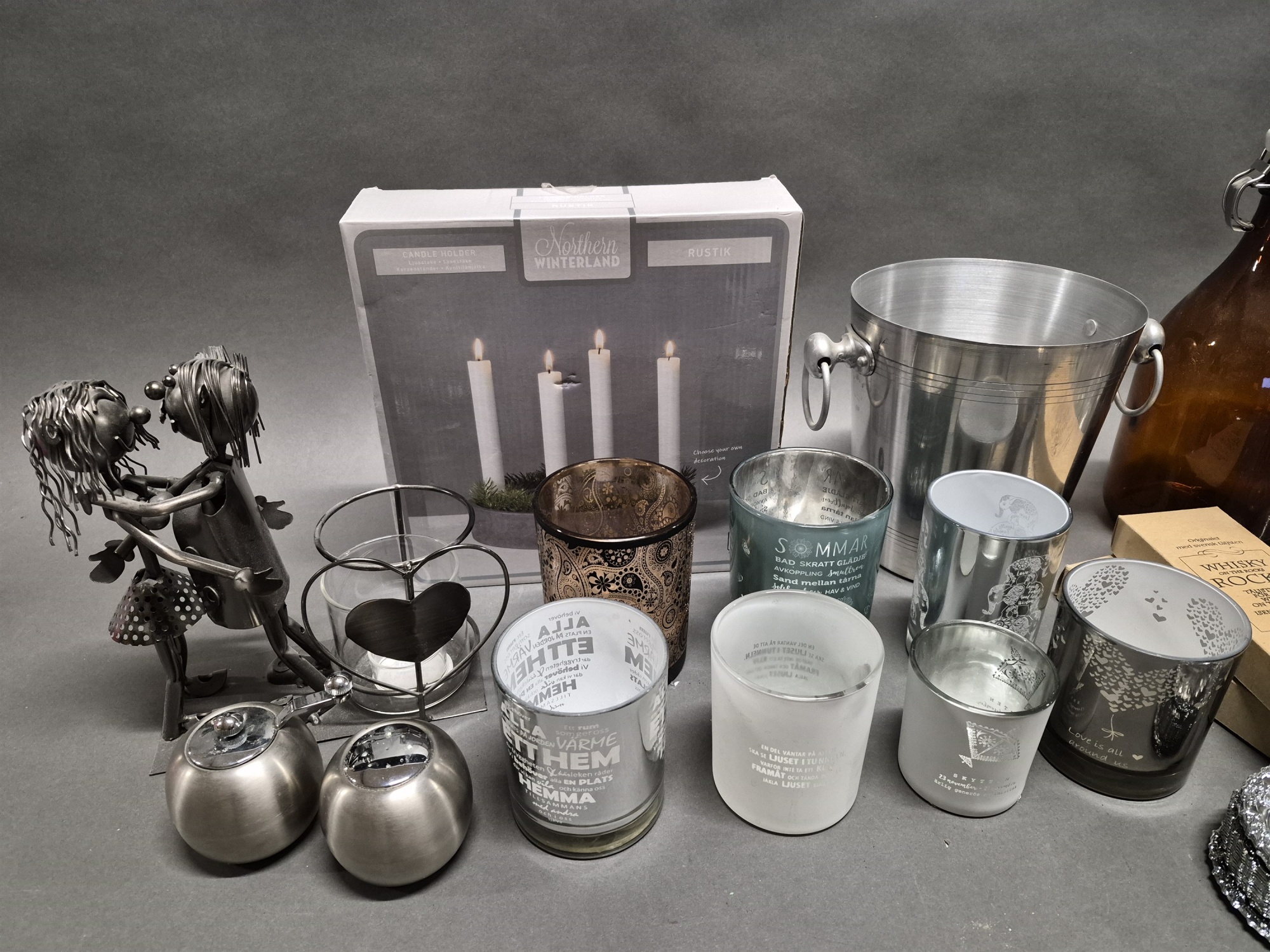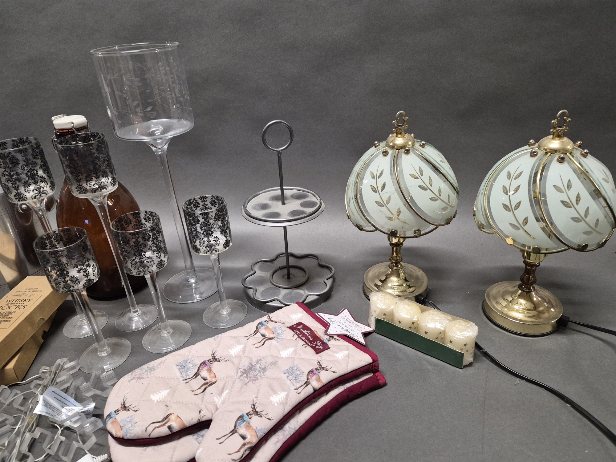 Parti bla ljuslyktor, drickaflaska och bordslampor 1 par, högsta höjd 40 cm