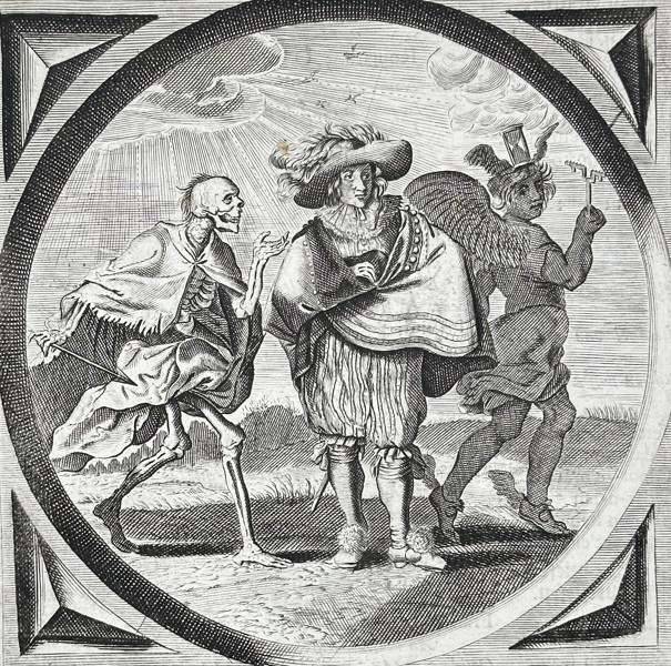 "Christelycke Bedenckingen. Il tiempo va, la morte viene." This engraving features a circular emblem set within a rectangular frame, depicting a skeletal figure of Death approaching a group of living figures, symbolizing the relentless passage of time and the inevitability of mortality. The work belongs to the series Christelycke Bedenckingen, part of the collected works titled Alle de Wercken by Jacob Cats. It was published in Amsterdam by Jan Jacobsz Schipper in 1658. This memento mori composition is a hallmark of the didactic and religious themes prevalent in seventeenth-century Dutch art and literature.