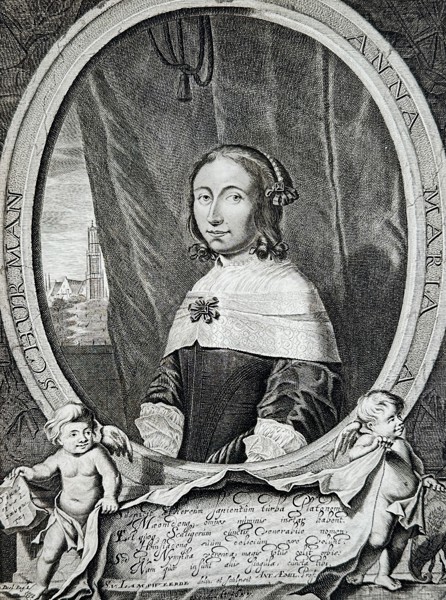"Anna Maria a Schurman." This engraving features a central oval portrait of the renowned Dutch scholar Anna Maria van Schurman, depicted in a dark bodice with a prominent white lace collar and a decorative brooch. The portrait is flanked by two putti; the upper figure holds a large scroll with a lengthy Latin inscription, while the lower figure holds a small open book. This print is an illustrative plate from the collected works titled Alle de Wercken by Jacob Cats. It was published in Amsterdam by Jan Jacobsz Schipper in 1658. The composition honors Van Schurman’s reputation as the most learned woman of her age, a sentiment frequently celebrated by her contemporary and friend, Jacob Cats.