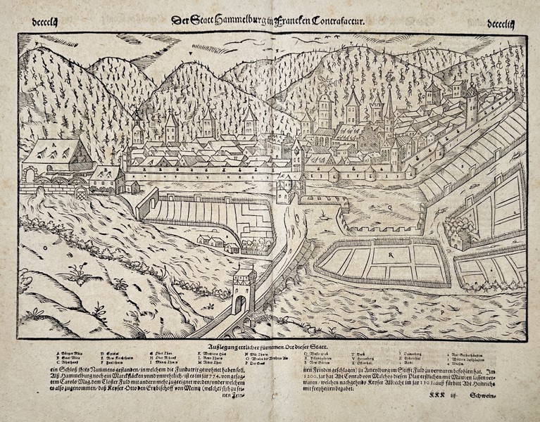 Der Statt Hammelburg in Francken Contrafactur. This woodcut presents a detailed panoramic view of the German city of Hammelburg in Franconia, nestled within a valley and surrounded by vine covered hills. The composition illustrates the medieval city walls, numerous church spires, and civic buildings, with a prominent gatehouse in the foreground connected by a bridge over a river. Extensive German text in Fraktur script is located below the image, providing a key to the principal landmarks and a historical description of the city. The work is a significant topographic plate from the Cosmographia, published in Basel by Heinrich Petri. This publication was the earliest German language description of the world and remained a fundamental geographical reference for decades.