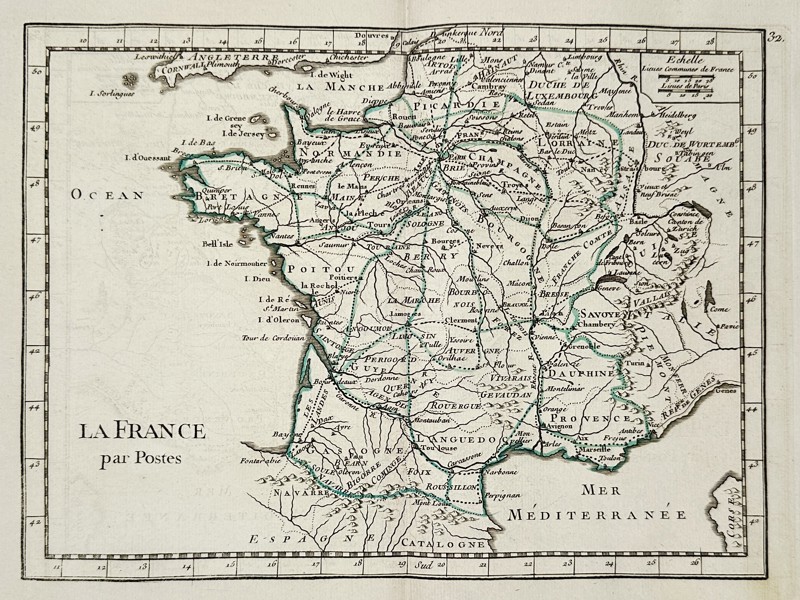 La France par Postes. This engraving presents a detailed geographical and administrative map of France, highlighting the established postal routes and relay stations of the mid eighteenth century. The map extends to include southern England, the Low Countries, and parts of the German and Italian states, with regional borders defined by delicate hand coloring. A scale of distance in French leagues is provided in the upper right corner, while the title is located in a simple script in the lower left. This work was published in Paris by Georges Louis Le Rouge and served as a practical guide for travelers and administrators within the French postal system.