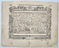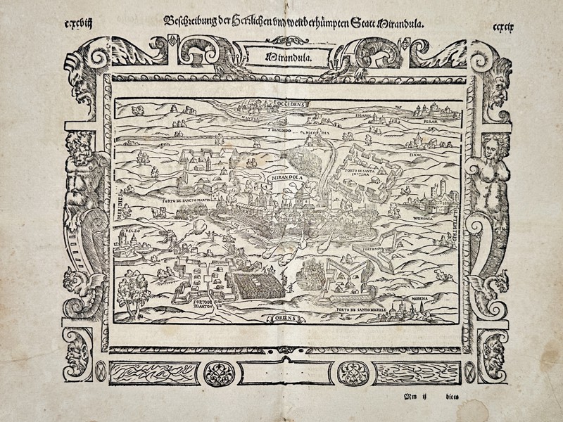 Beschreibung der Herrlichen und weitberhumpte Statt Mirandula. This woodcut presents a detailed bird eye panoramic view of the fortified city of Mirandola in northern Italy. The composition illustrates the extensive star-shaped defensive walls, bastions, and moats surrounding the urban center, which features numerous towers, churches, and civic buildings. The surrounding landscape is depicted with smaller satellite fortifications such as Forto de Sancto Martin and Forto de Sancto Michele, along with stylized topographical features and directional labels including Occidens, Oriens, Meridies, and Septemtrio. The entire map is enclosed within an elaborate architectural border featuring grotesque masks, cornucopias, and allegorical figures. This work is a significant topographical plate from the Cosmographia, published in Basel by Heinrich Petri. This publication was the earliest German language description of the world and remained a fundamental geographical reference for decades.