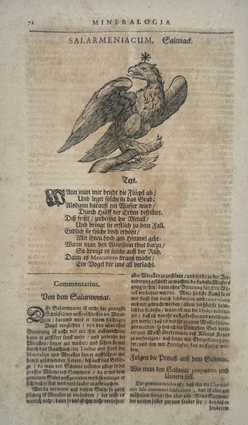 "Salarmeniacum. Salmiack." depicts an eagle perched on a branch with its wings partially spread, serving as an alchemical symbol for sal ammoniac. This engraving was published in Bologna in 1648 within the Musaeum Metallicum, a posthumous work printed by Giovanni Battista Ferroni. The central figure is surrounded by gothic letterpress text that provides a poetic and scientific commentary on the element's properties and its relationship to the spirit of mercury. In the alchemical tradition, the eagle often represented the volatile nature of certain substances that could "fly" or sublimate during heating processes.