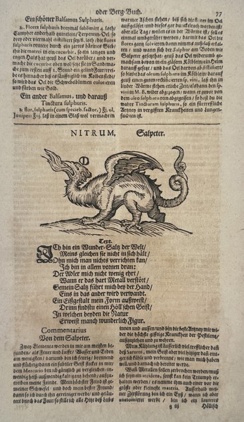 "Nitrum. Salpeter." depicts a winged dragon with a coiled tail, symbolizing the element nitre or saltpeter. This engraving was published in Bologna in 1648 within the Musaeum Metallicum, a posthumous work printed by Giovanni Battista Ferroni. The central figure is surrounded by gothic letterpress text that provides alchemical and scientific commentary on the mineral's properties and its vital role in the composition of various chemical compounds. In the seventeenth-century alchemical tradition, the dragon was a frequent symbol for powerful, volatile, or transformative substances due to its association with both earth and air.