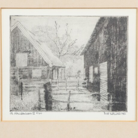 Bilder Åke Sjölund. Etsning "På stallbacken ll" 1983 6/60. 12x10 cm.