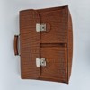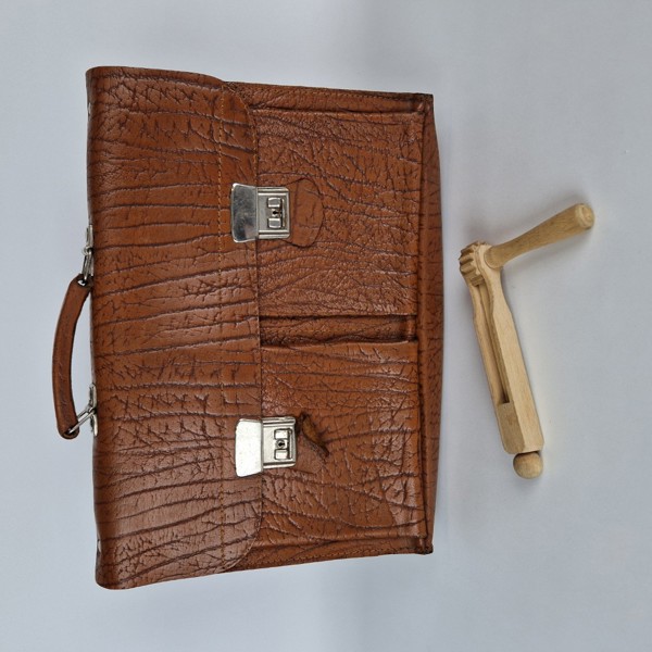 Klassisk bandyportfölj. Dokumentportfölj av strukturerat skinn med två ytterfickor och en harskramla i trä.