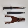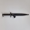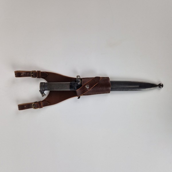 Jernbolaget Eskilstuna. Helt tillverkad av stål med rörformigt, lättrat grepp. Balja med lås. Bäranordning av läder, för befälsförande personer.