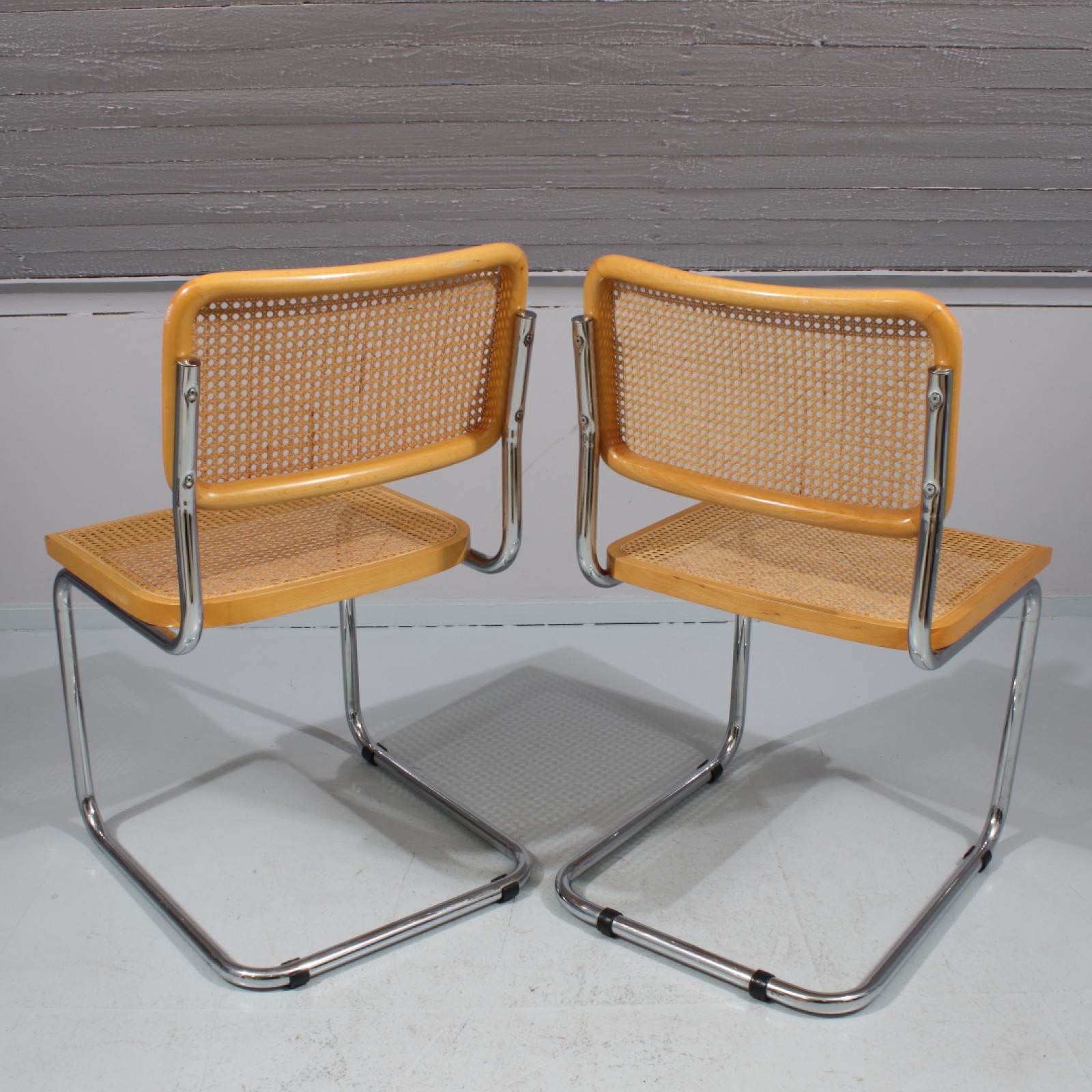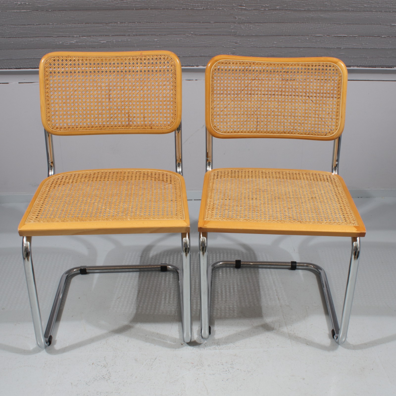 2 stycken (1 par), stommar i kromad metall, sitsar och ryggbrickor i lövträ samt flätad rotting, mindre bruksslitage, Rh.83, B.46, Sh.46 cm. (vån3)