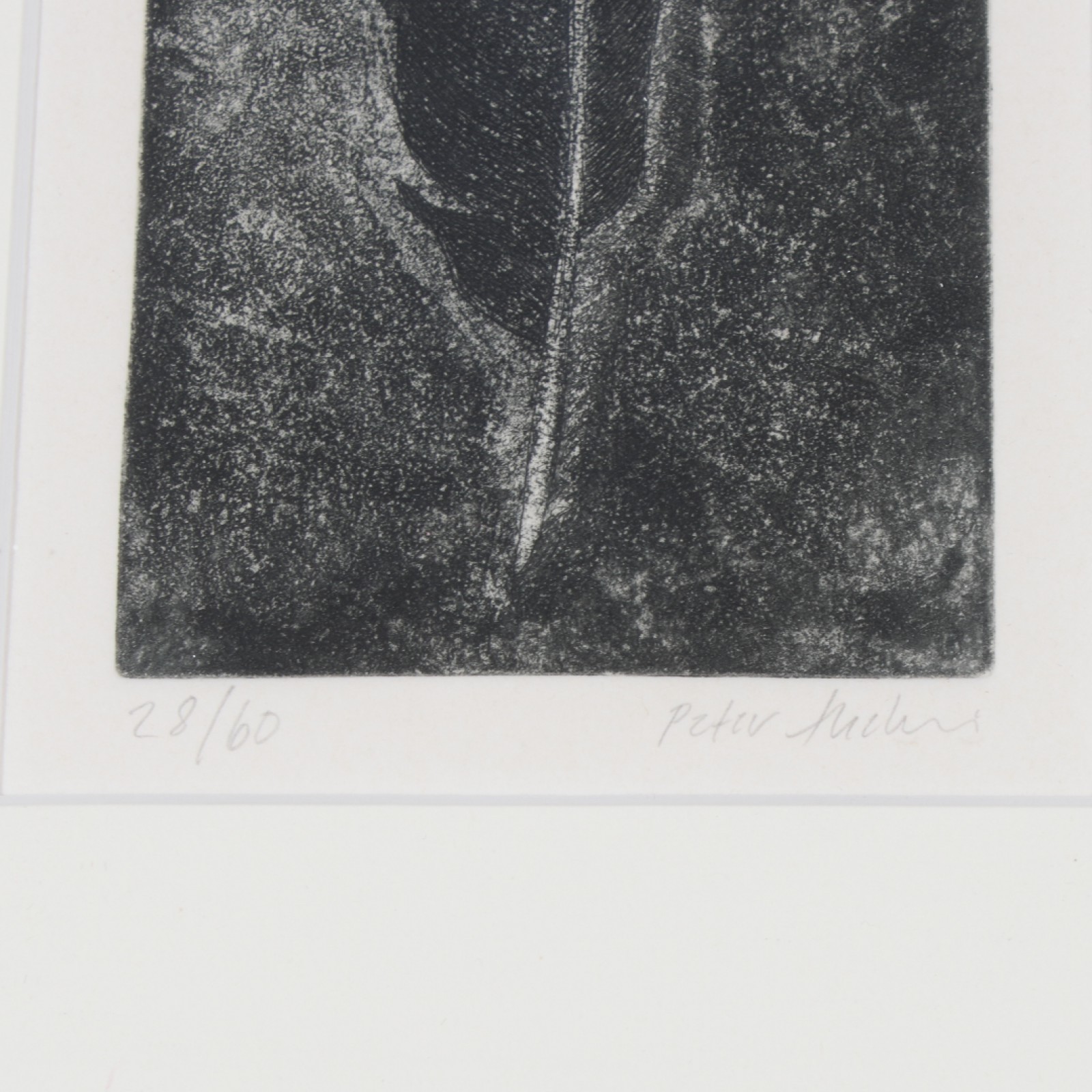 Etsning, "Fjäder", signerad samt numrerad 28/60, ram 36x27 cm, passepartout 18,5x11 cm. (vån3)