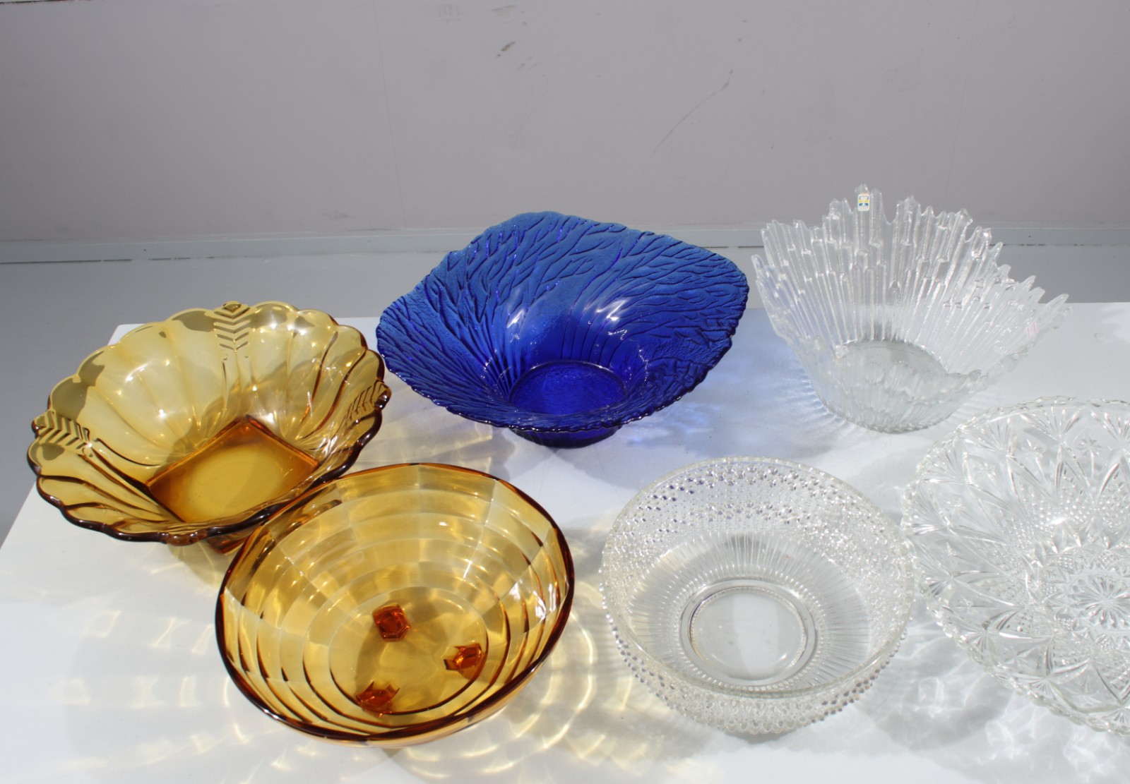 6 stycken, glas, olika modeller, höjd 14 cm och lägre, diameter 33 cm och mindre. (vån3)
