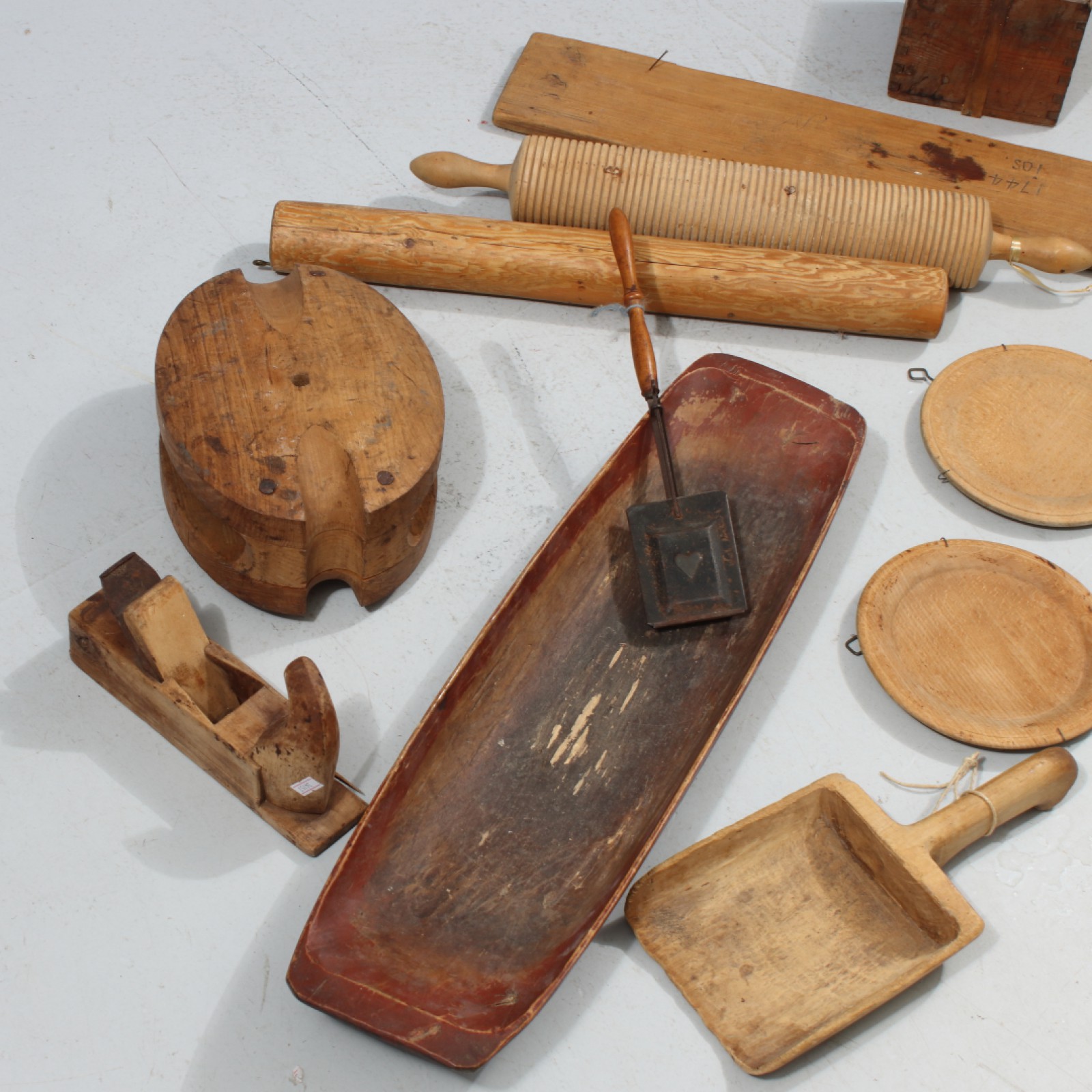 Samling, trä, 18,1900-tal, bl.a tråg, tallrikar, längd tråg 62 cm. (vån3)