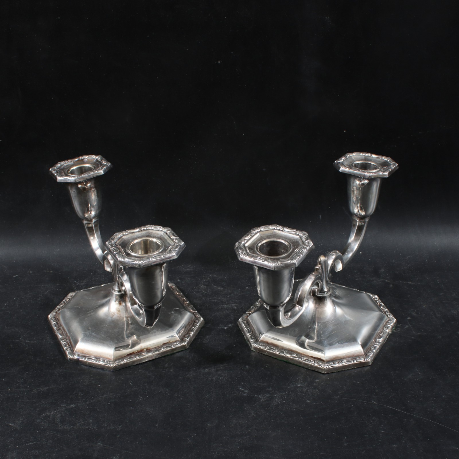 2 stycken (1 par), kontrollerat silver, 2-armade, fyllda, höjd 12 cm, bredd 22 cm, bruttovikt 774 gram. (vån3)