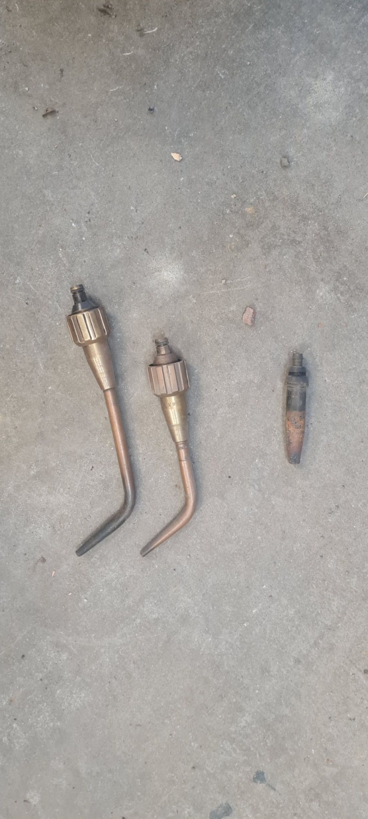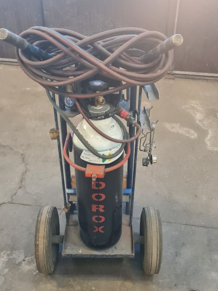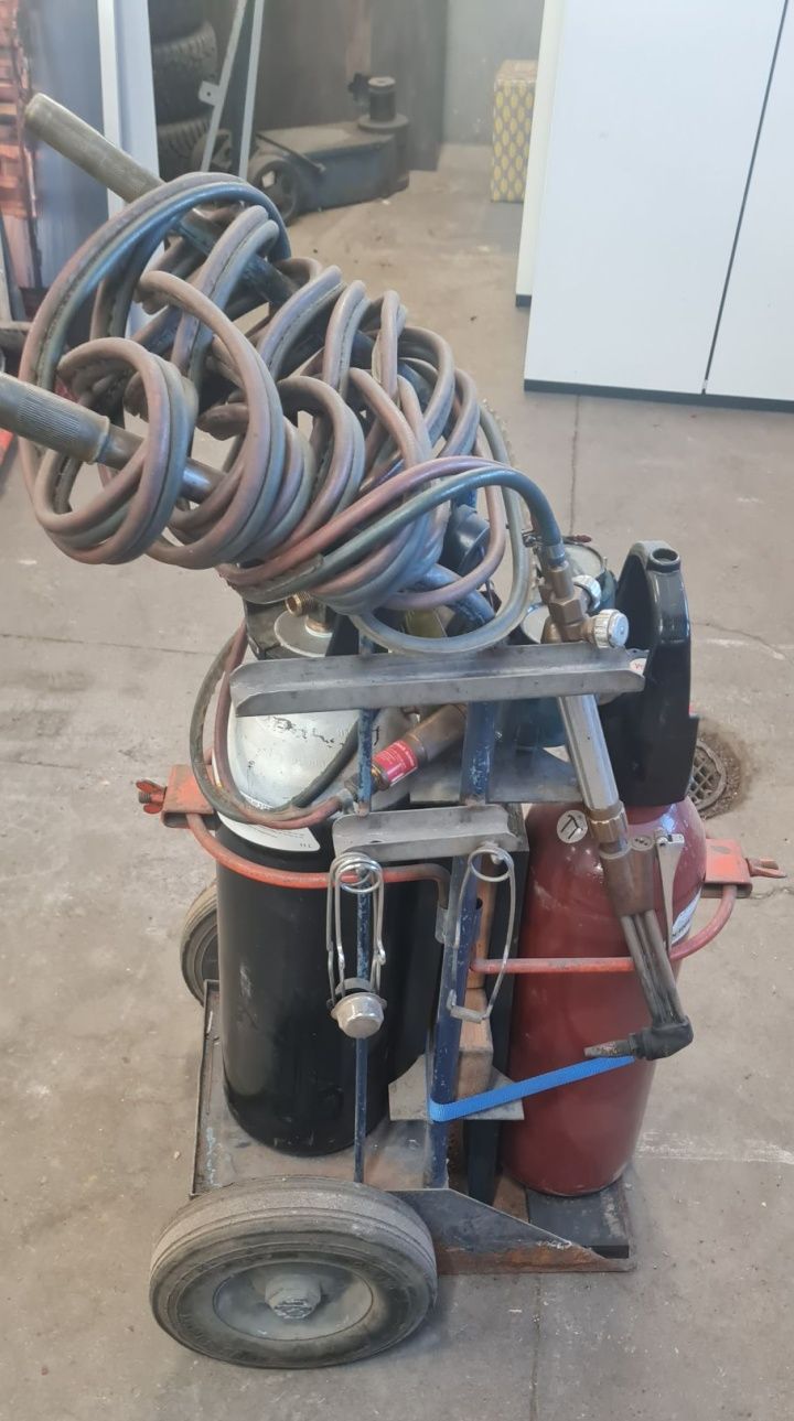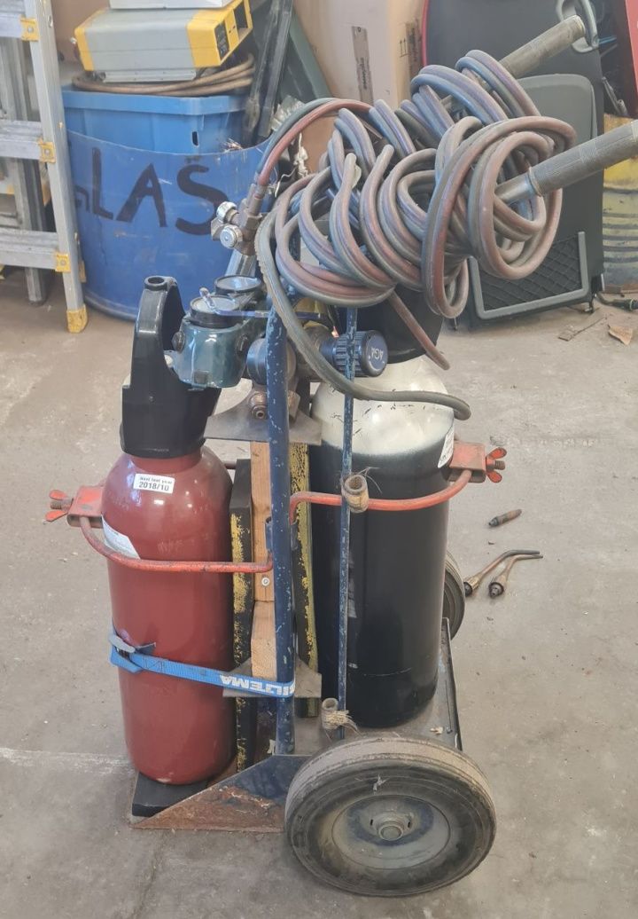 Skärbrännare med gasregulatorer, tubkärra, friköpt gastub Oxygen 10kg, friköpt gastub Acetylen 10kg