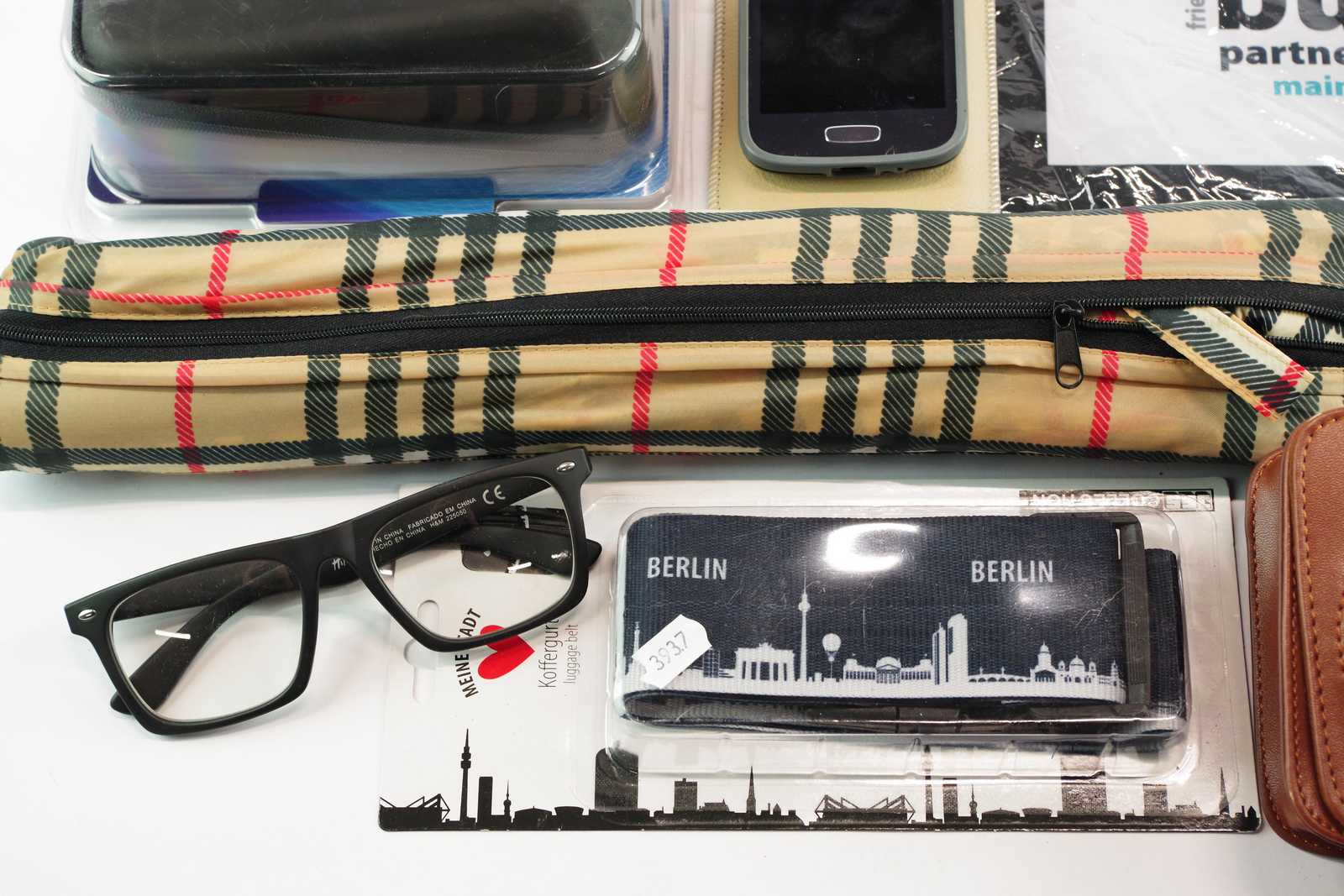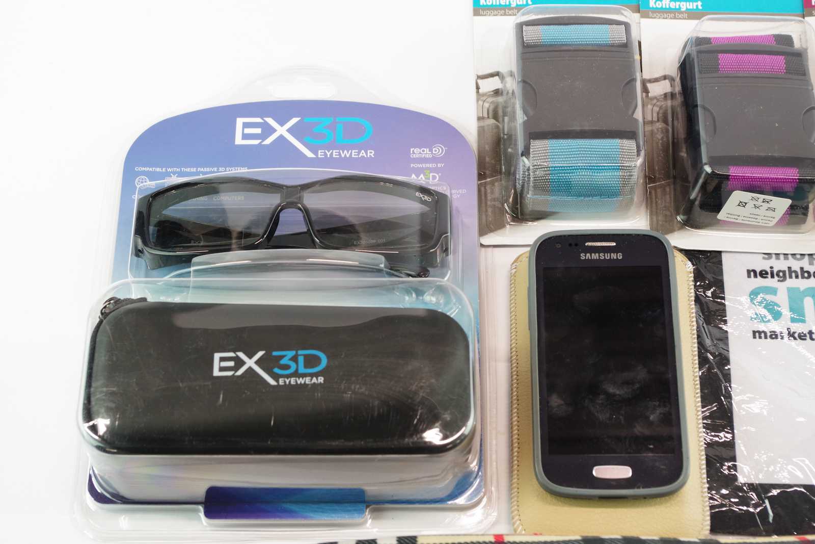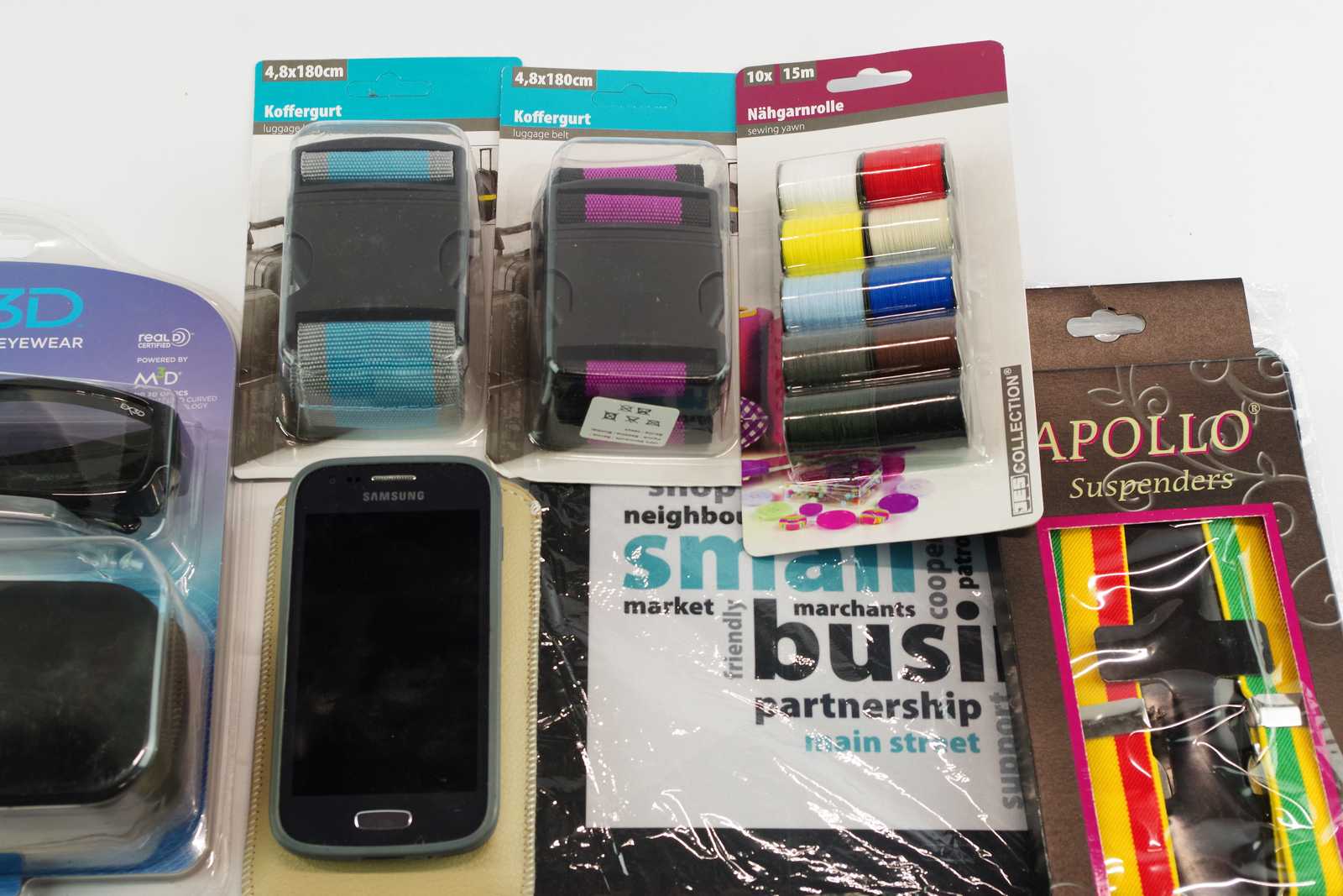 PARAPLY, 3D-GLASÖGON, SYTRÅD, BAGAGEREMMAR mm