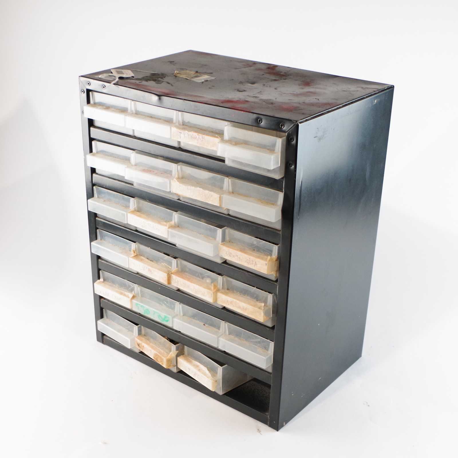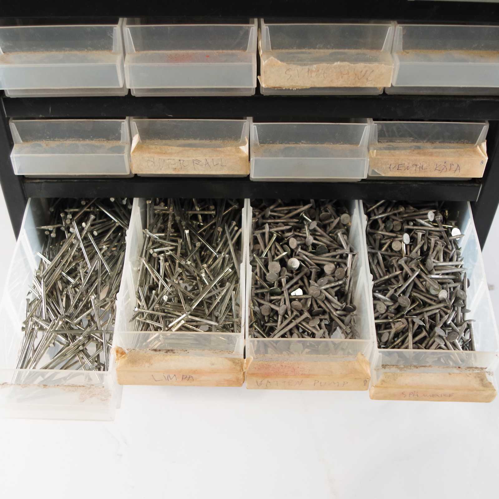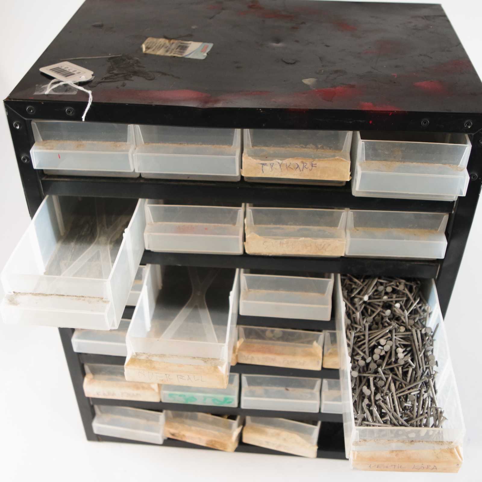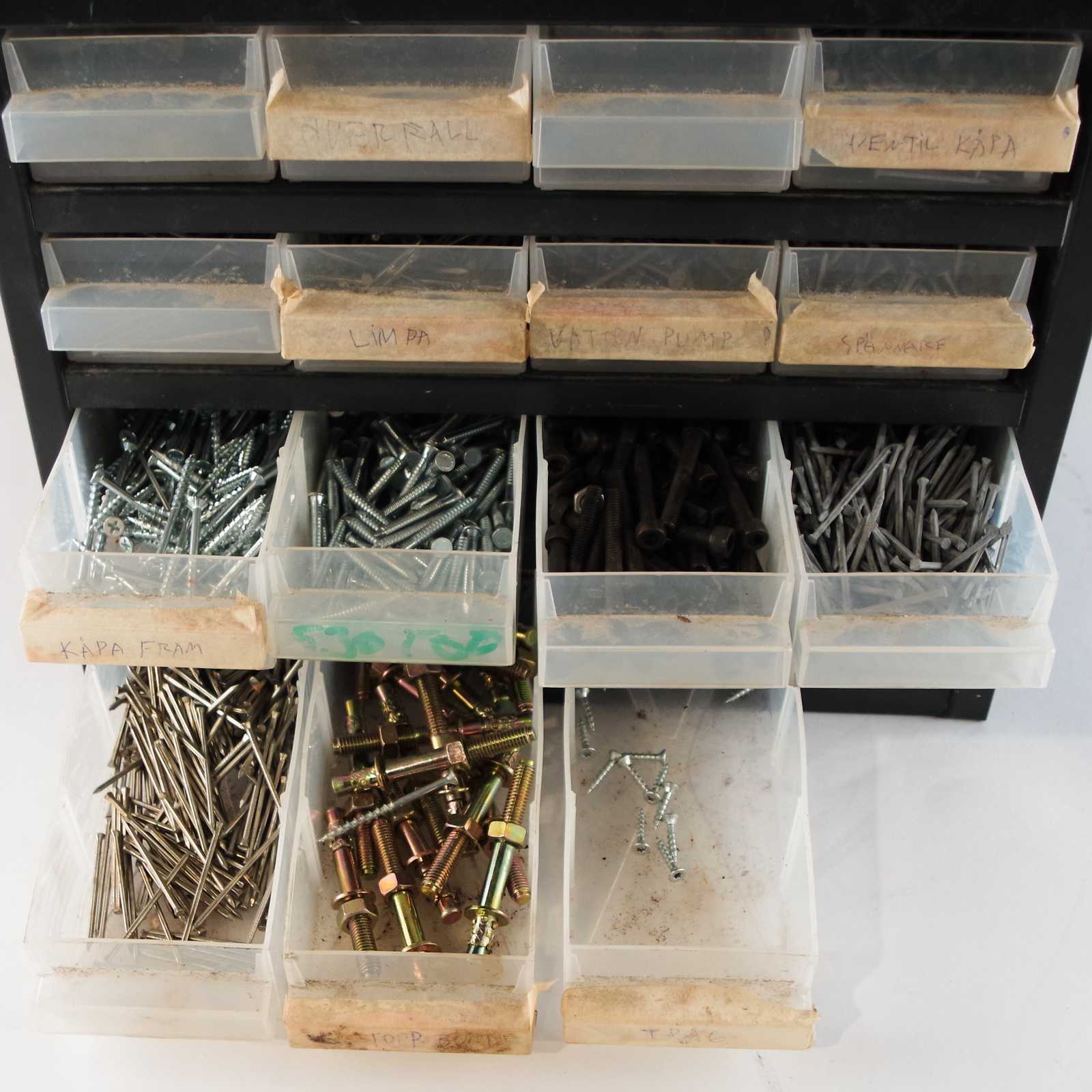 SORTIMENTFACK med innehåll. H:43x 35x 24 cm. (bruksslitage, 1st burk saknas)