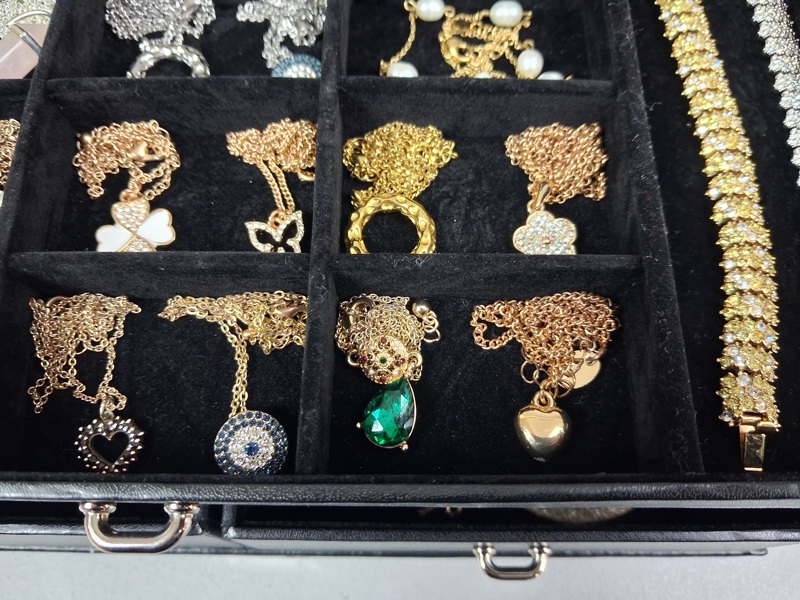 Smyckesskrin i konstskinn. Full med diverse bijouterier.