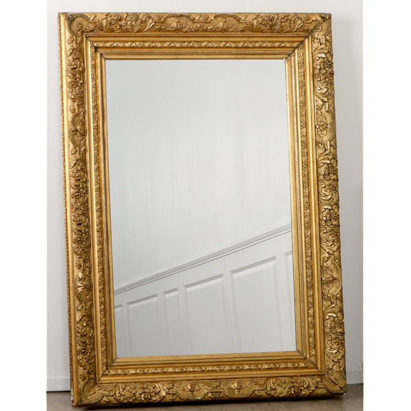 Ram med riklig dekor av bland annat akantus och blommor. Förgylld och bronserad. Etikettmärkt. Kompletterad med spegelglas.