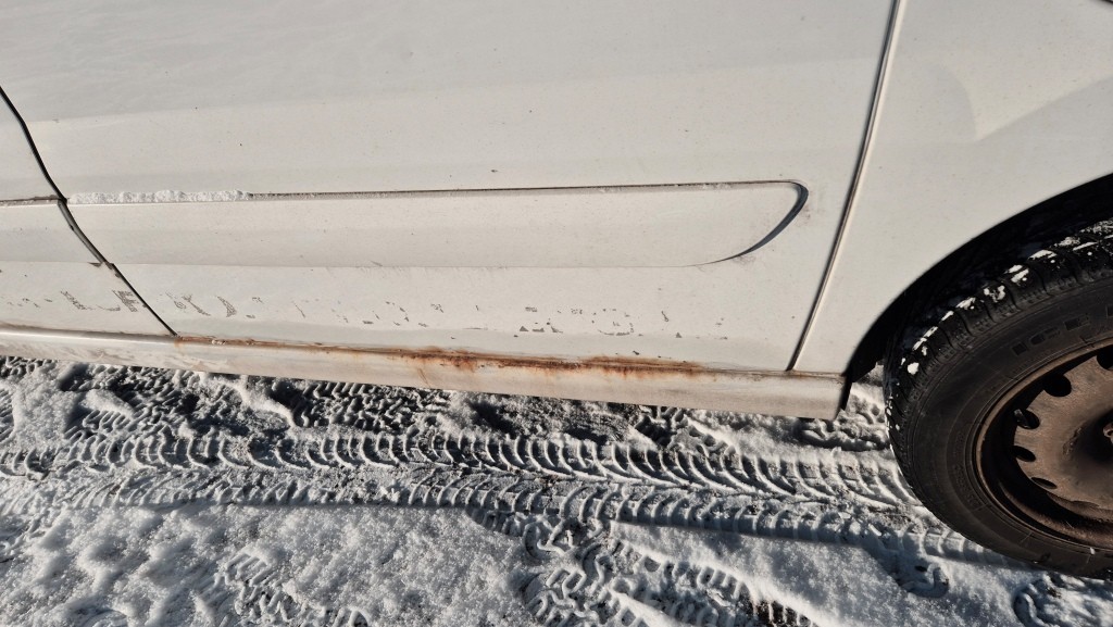 Bilen har tryckta logotyper på sidorna och bak som är retuscherade på bilderna
