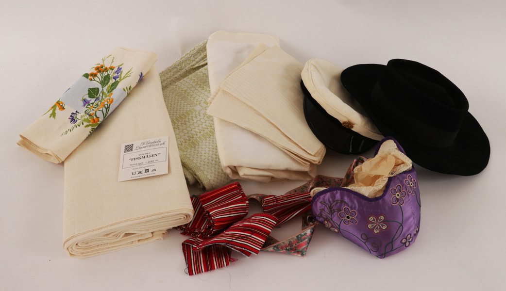 Dräkthatt, Glynn & co, London. Duk, "Fiskmåsen", Klässbols. Dräkthätta, m.m.