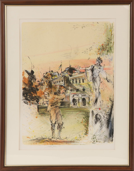 Färglitografi, golfspelare. Signerat. Inramat.